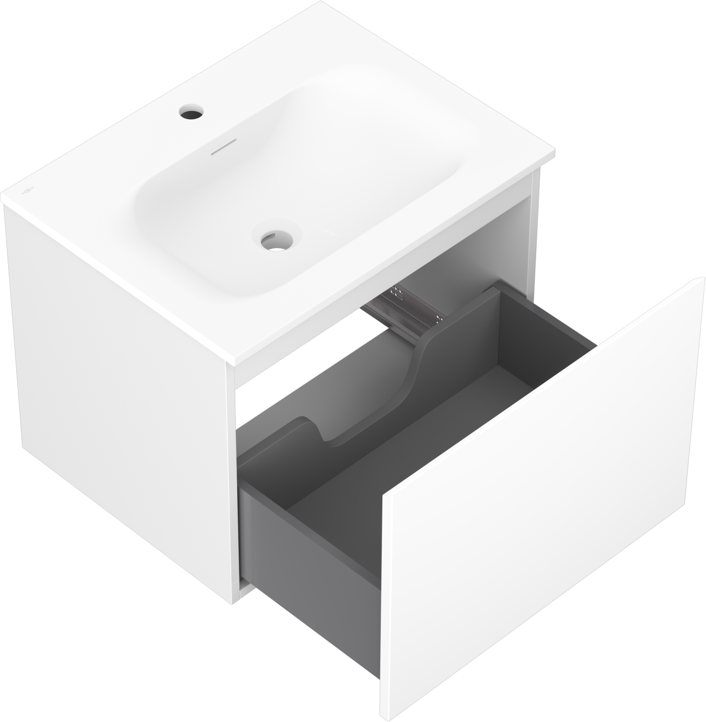 Utskärningen i lådan är utformad på ett sådant sätt att den rymmer vattenlåset som är nödvändigt i tvättställsinstallationer. Tack vare detta kan möbeln installeras fullt ut funktionellt, utan att behöva avstå från utrymme i lådan för installationen.