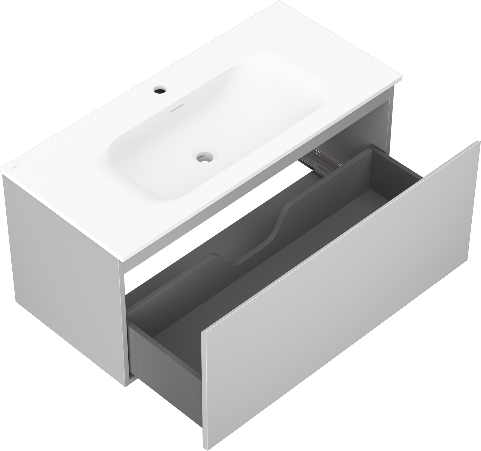 Utskärningen i lådan är utformad på ett sådant sätt att den rymmer vattenlåset som är nödvändigt i tvättställsinstallationer. Tack vare detta kan möbeln installeras fullt ut funktionellt, utan att behöva avstå från utrymme i lådan för installationen.