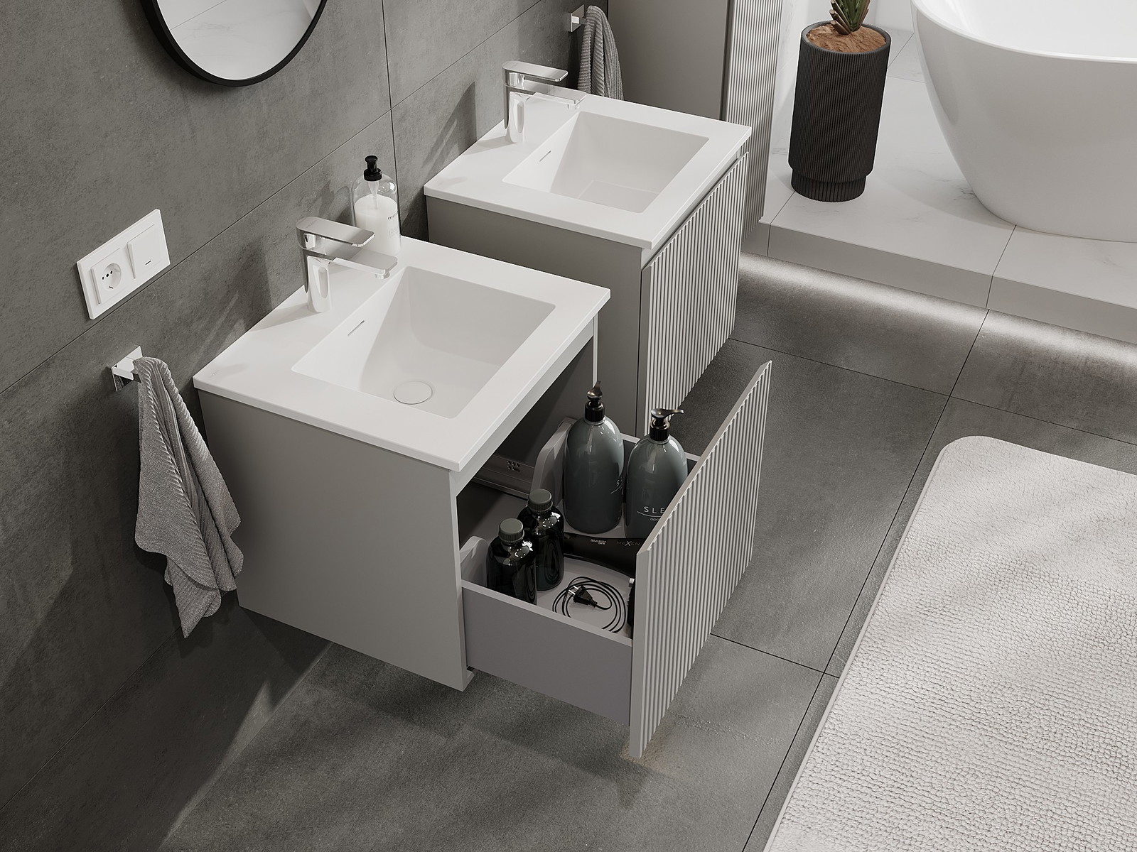 Mexen Rivel badrumsskåp 50 cm med handfat Otis, 1 låda, räfflad, grå matt/vit matt - 91A20-05047-1-BF62-W18M01