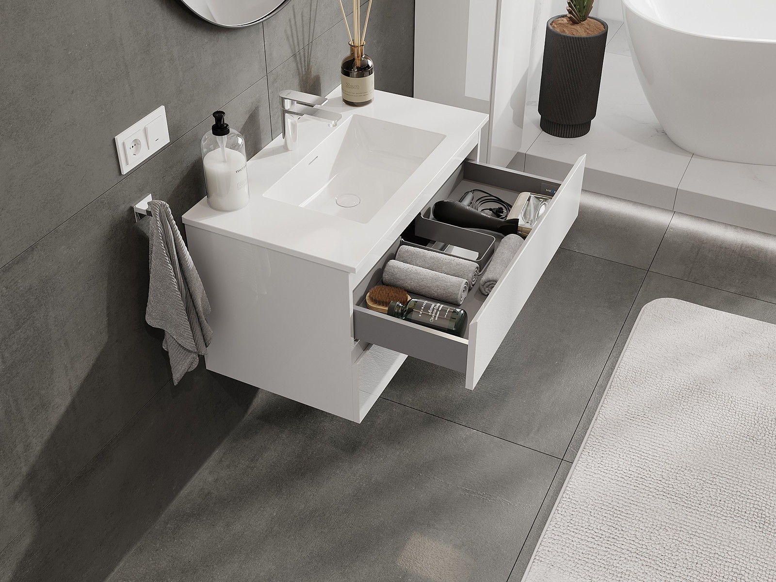 Utskärningen i lådan är utformad på ett sådant sätt att den rymmer vattenlåset som är nödvändigt i tvättställsinstallationer. Tack vare detta kan möbeln installeras fullt ut funktionellt, utan att behöva avstå från utrymme i lådan för installationen.