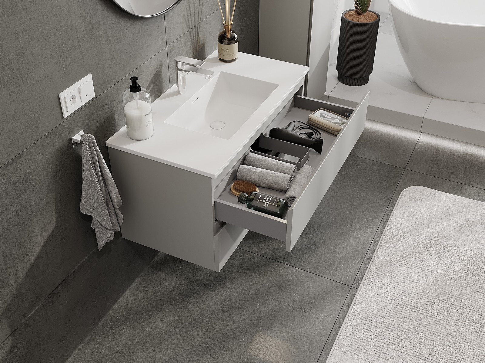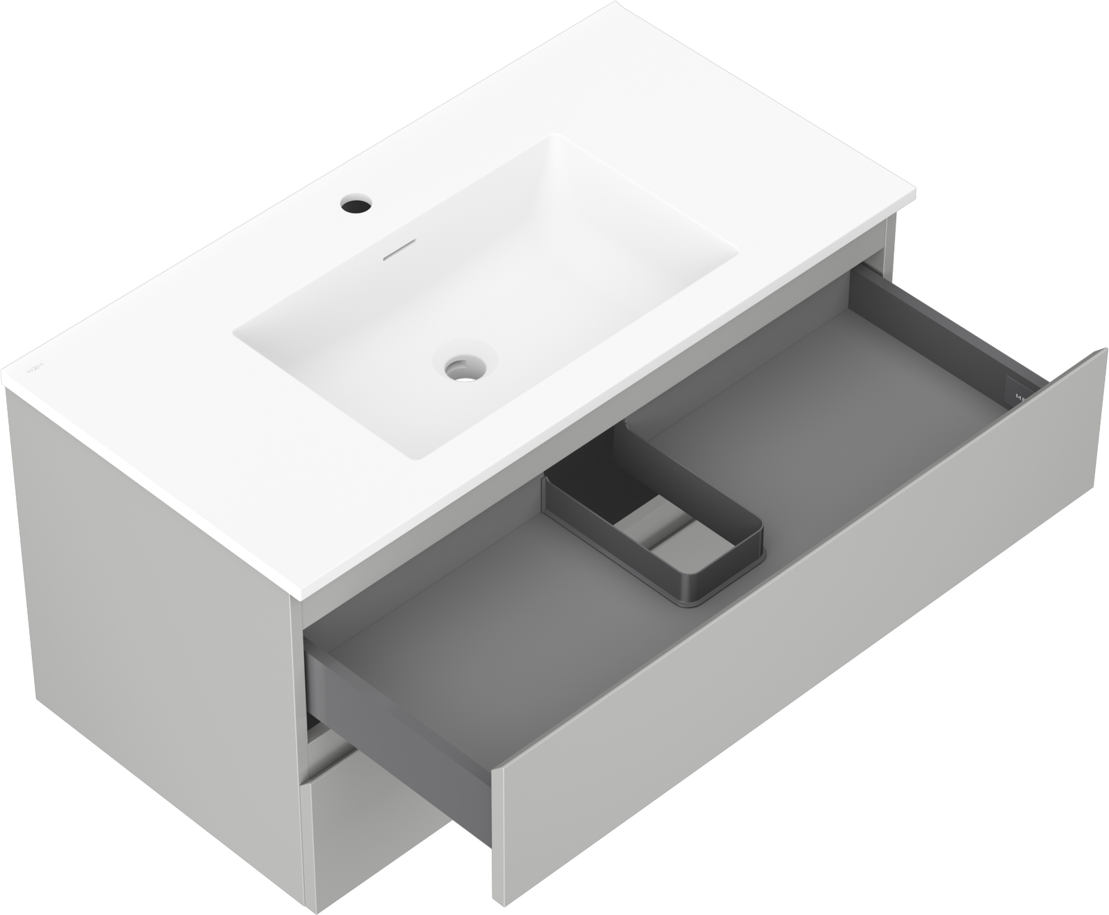 Utskärningen i lådan är utformad på ett sådant sätt att den rymmer vattenlåset som är nödvändigt i tvättställsinstallationer. Tack vare detta kan möbeln installeras fullt ut funktionellt, utan att behöva avstå från utrymme i lådan för installationen.