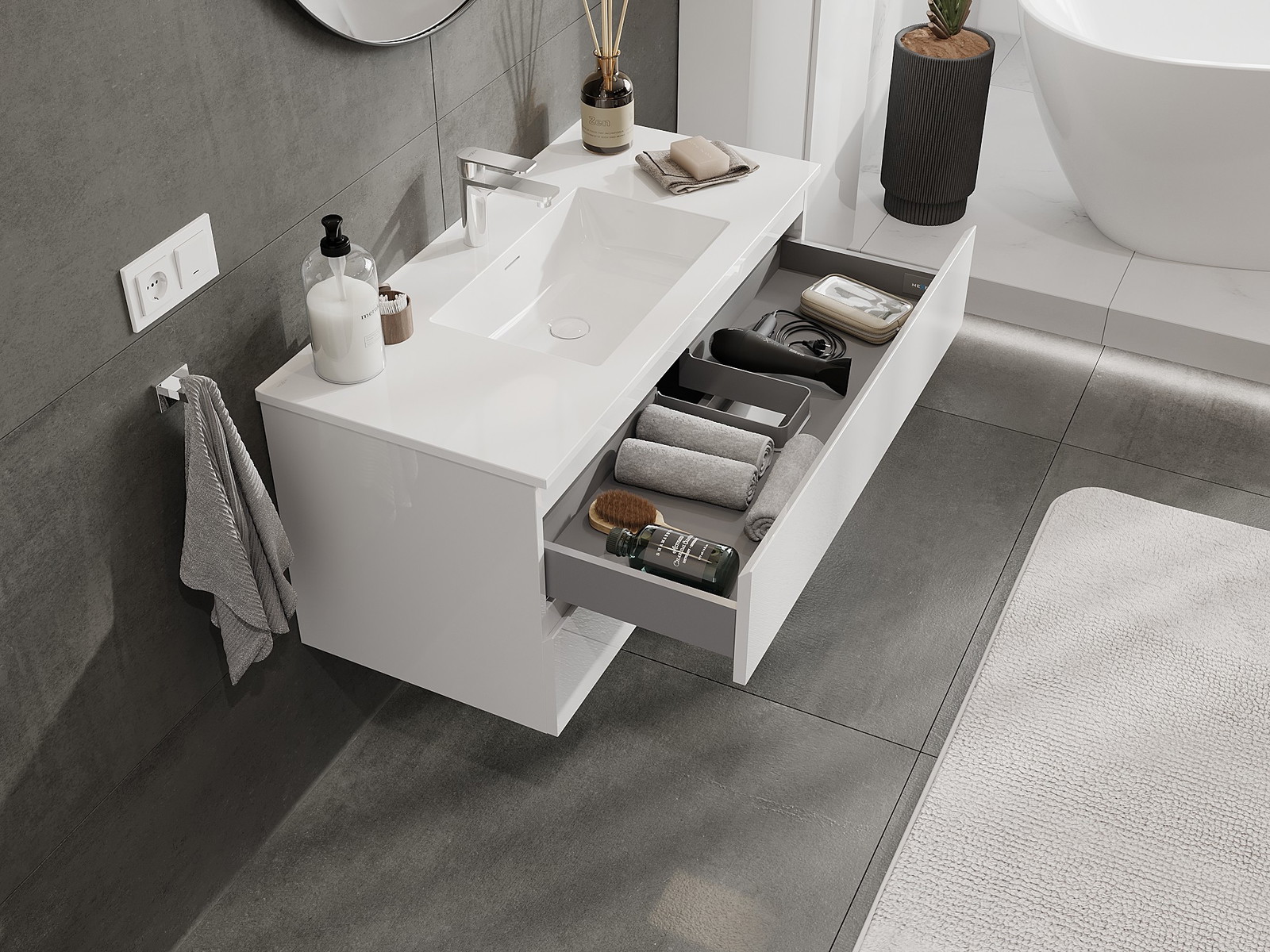 Utskärningen i lådan är utformad på ett sådant sätt att den rymmer vattenlåset som är nödvändigt i tvättställsinstallationer. Tack vare detta kan möbeln installeras fullt ut funktionellt, utan att behöva avstå från utrymme i lådan för installationen.