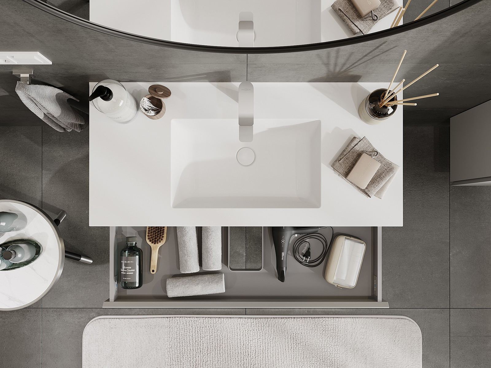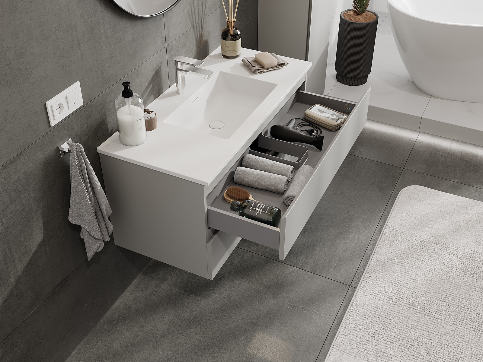 Utskärningen i lådan är utformad på ett sådant sätt att den rymmer vattenlåset som är nödvändigt i tvättställsinstallationer. Tack vare detta kan möbeln installeras fullt ut funktionellt, utan att behöva avstå från utrymme i lådan för installationen.