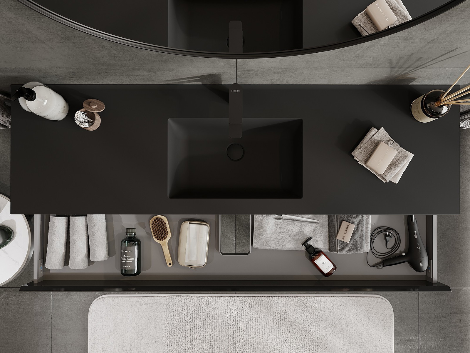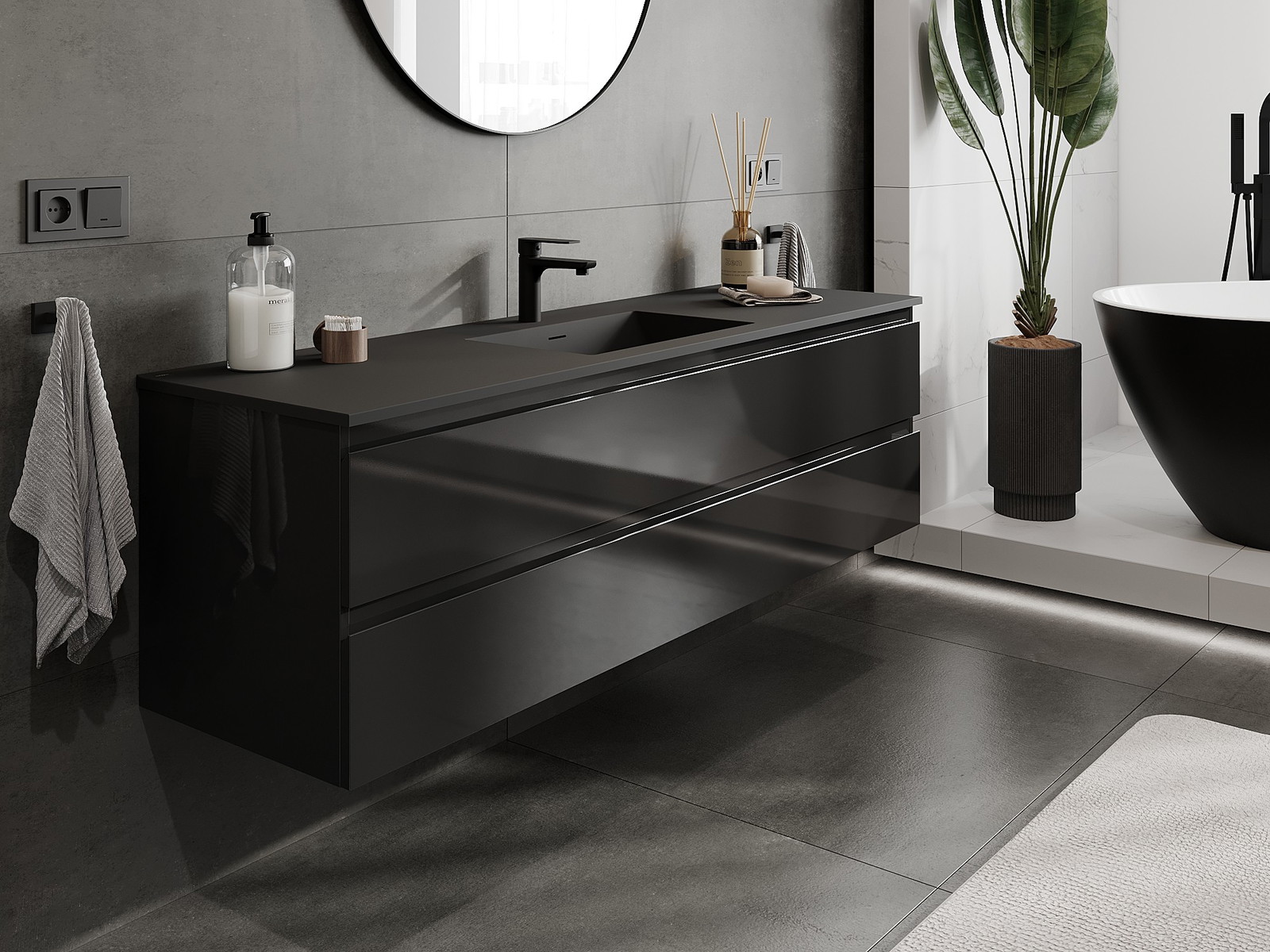 Mexen Orio badrumsskåp 160 cm med tvättställ Otis, 2 lådor, svart glans/svart matt - 91A10-16047-2-BFF70-W18M71