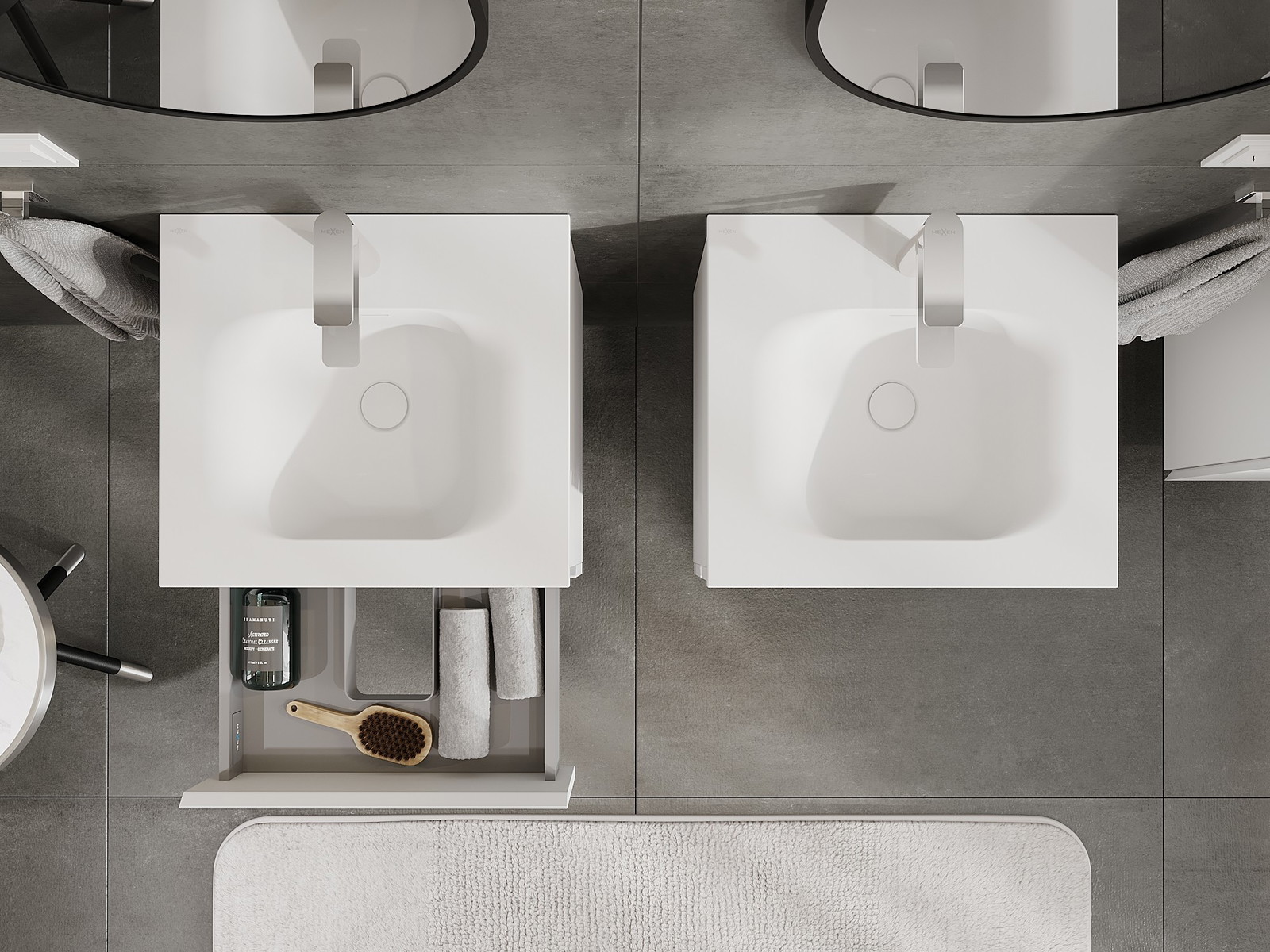 Utskärningen i lådan är utformad på ett sådant sätt att den rymmer vattenlåset som är nödvändigt i tvättställsinstallationer. Tack vare detta kan möbeln installeras fullt ut funktionellt, utan att behöva avstå från utrymme i lådan för installationen.