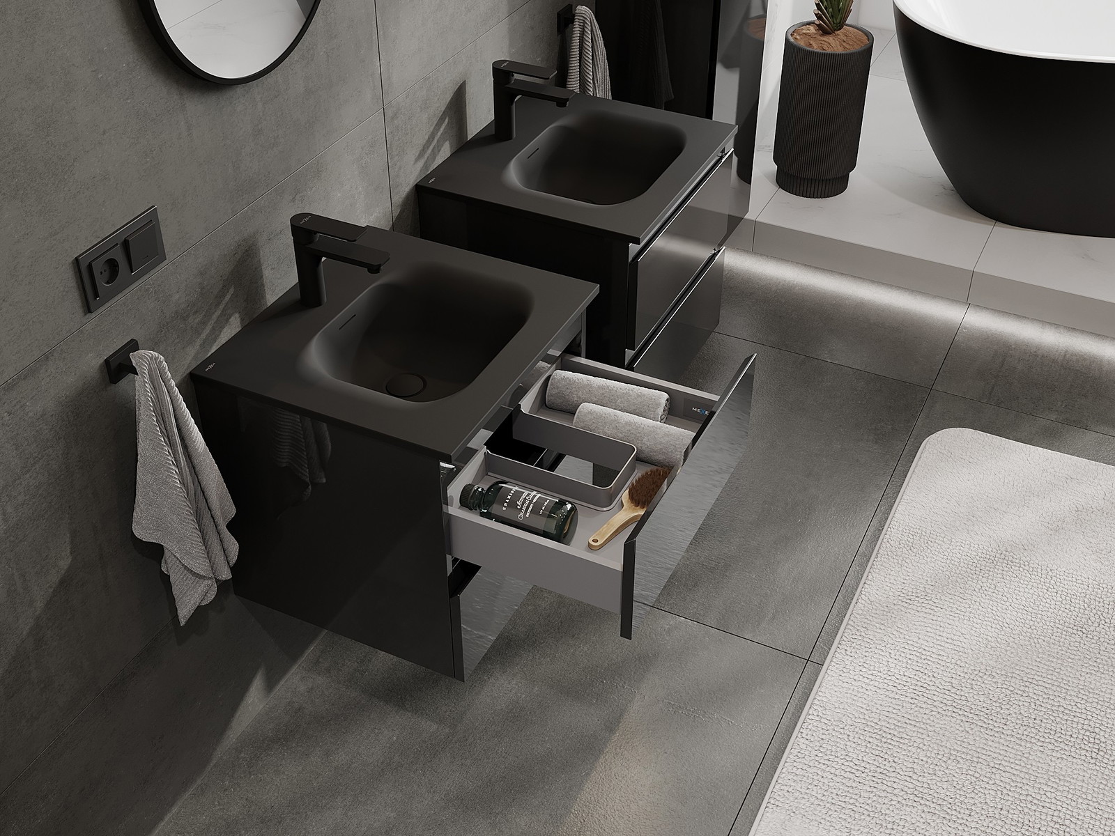 Våra modulära badrumsmöbler kan kombineras i olika färgkonfigurationer, vilket möjliggör fullständig personalisering. Du kan välja både utseende och funktioner för respektive delar, vilket gör att möblerna kan anpassas till dina egna stilistiska och funktionella preferenser.