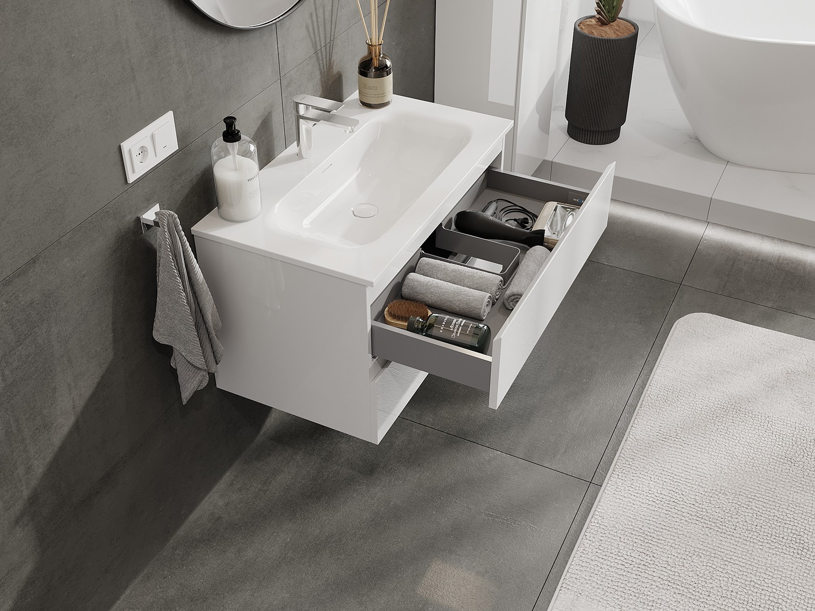 Utskärningen i lådan är utformad på ett sådant sätt att den rymmer vattenlåset som är nödvändigt i tvättställsinstallationer. Tack vare detta kan möbeln installeras fullt ut funktionellt, utan att behöva avstå från utrymme i lådan för installationen.