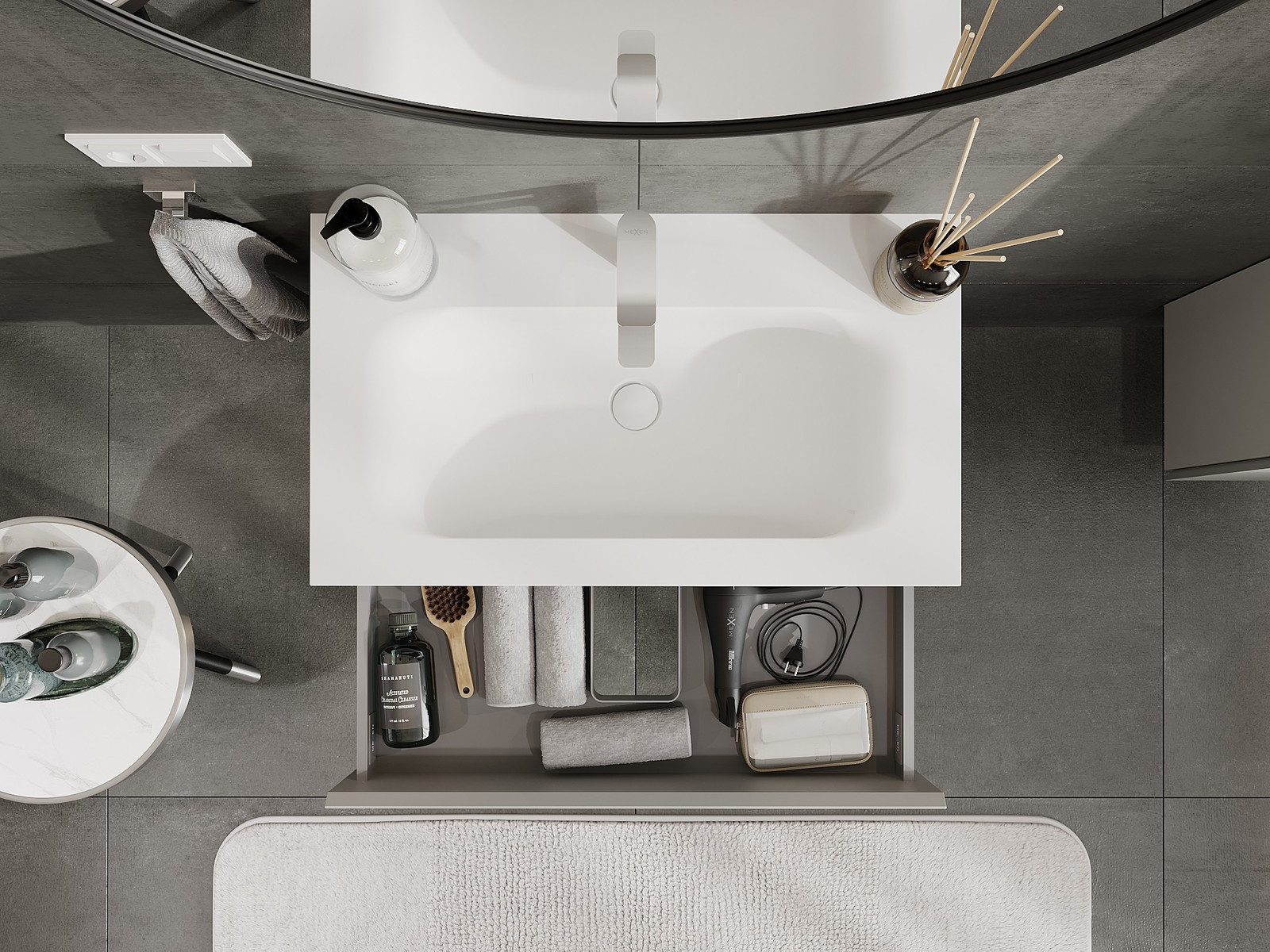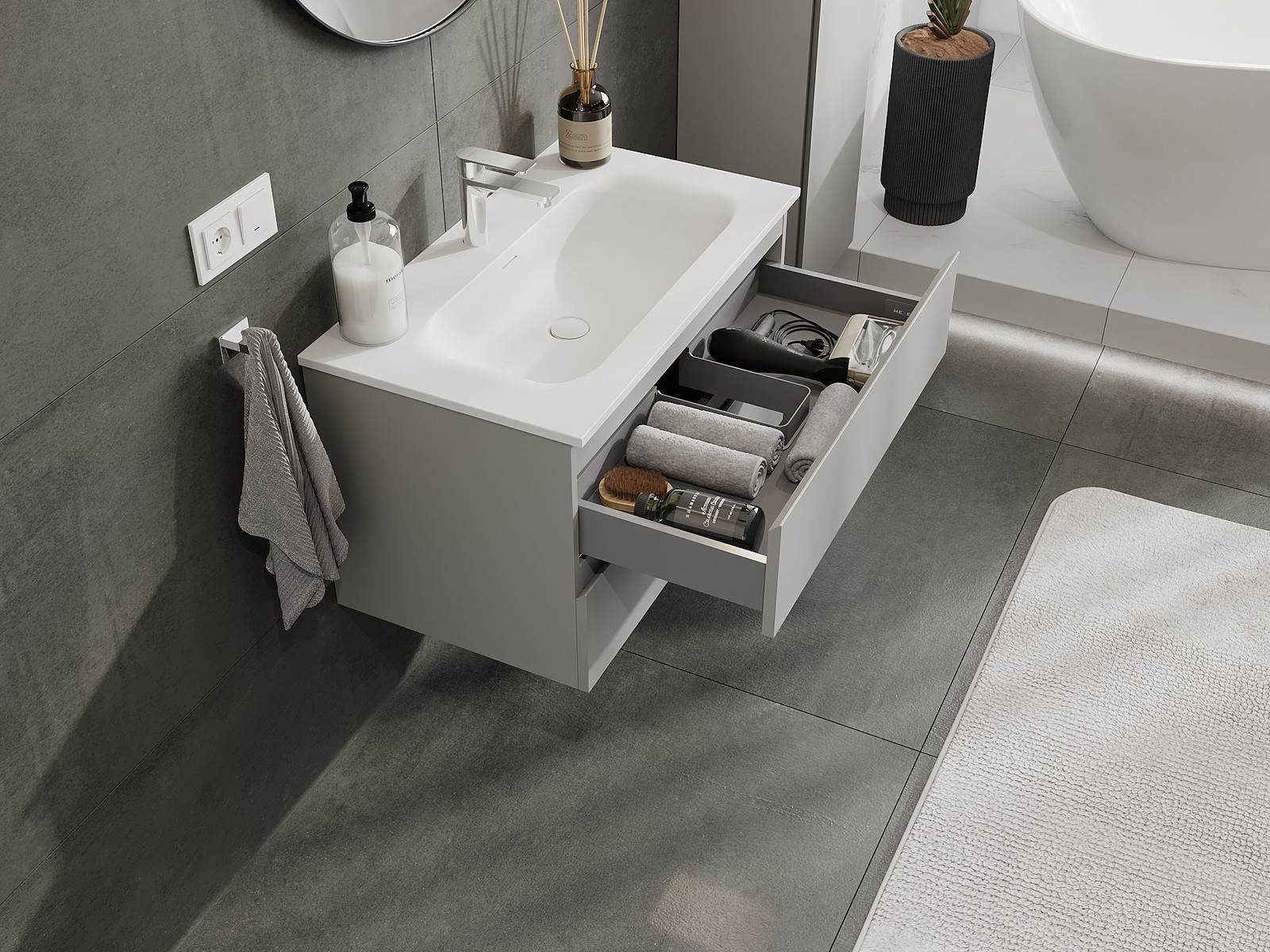 Utskärningen i lådan är utformad på ett sådant sätt att den rymmer vattenlåset som är nödvändigt i tvättställsinstallationer. Tack vare detta kan möbeln installeras fullt ut funktionellt, utan att behöva avstå från utrymme i lådan för installationen.