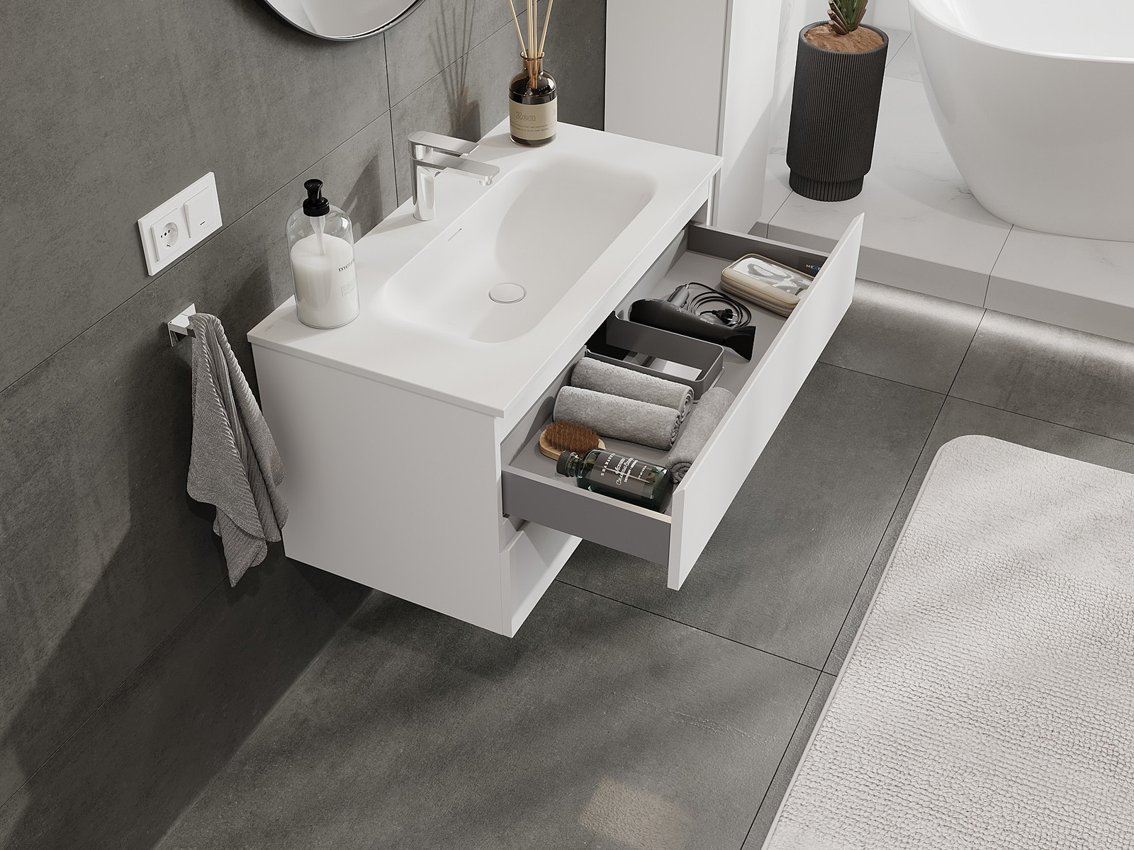 Utskärningen i lådan är utformad på ett sådant sätt att den rymmer vattenlåset som är nödvändigt i tvättställsinstallationer. Tack vare detta kan möbeln installeras fullt ut funktionellt, utan att behöva avstå från utrymme i lådan för installationen.