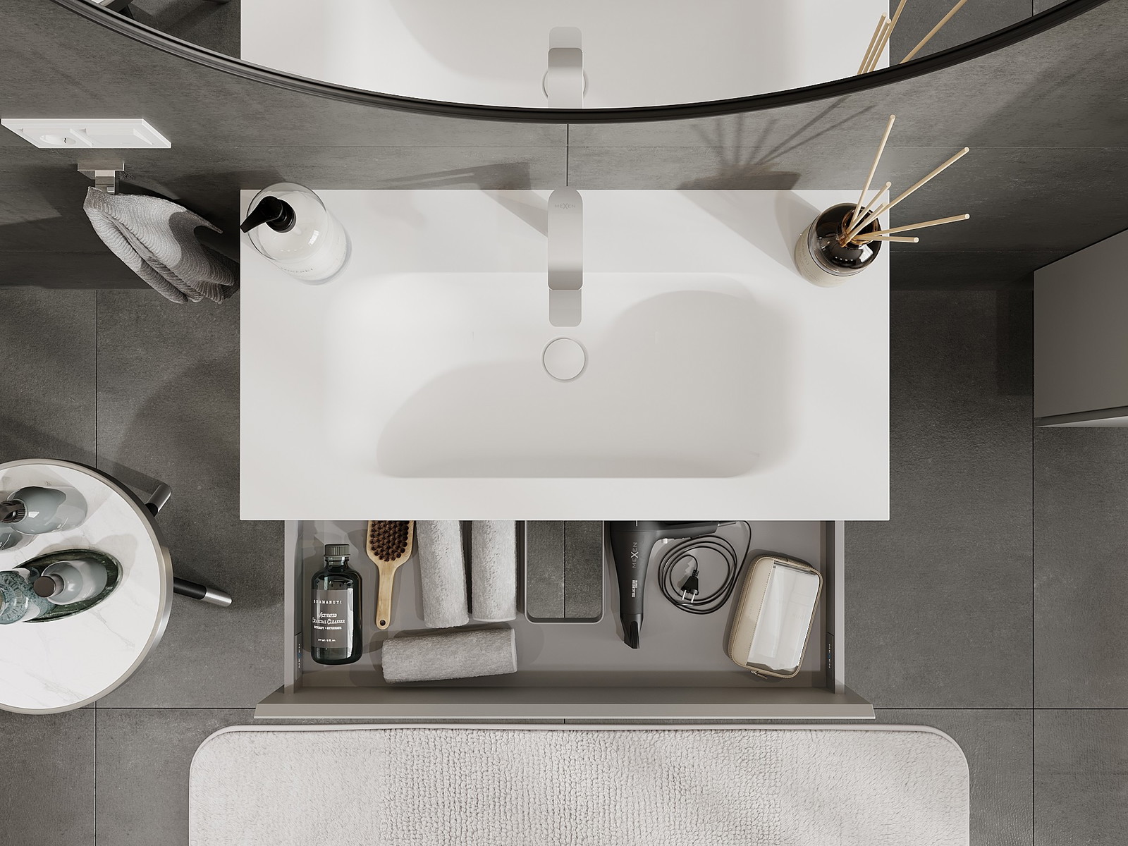 Tvättstället har ett hål där vi kan montera en kran. Detta sparar värdefull plats i badrummet och framhäver dess estetik. Denna lösning möjliggör även enklare rengöring runt tvättstället.