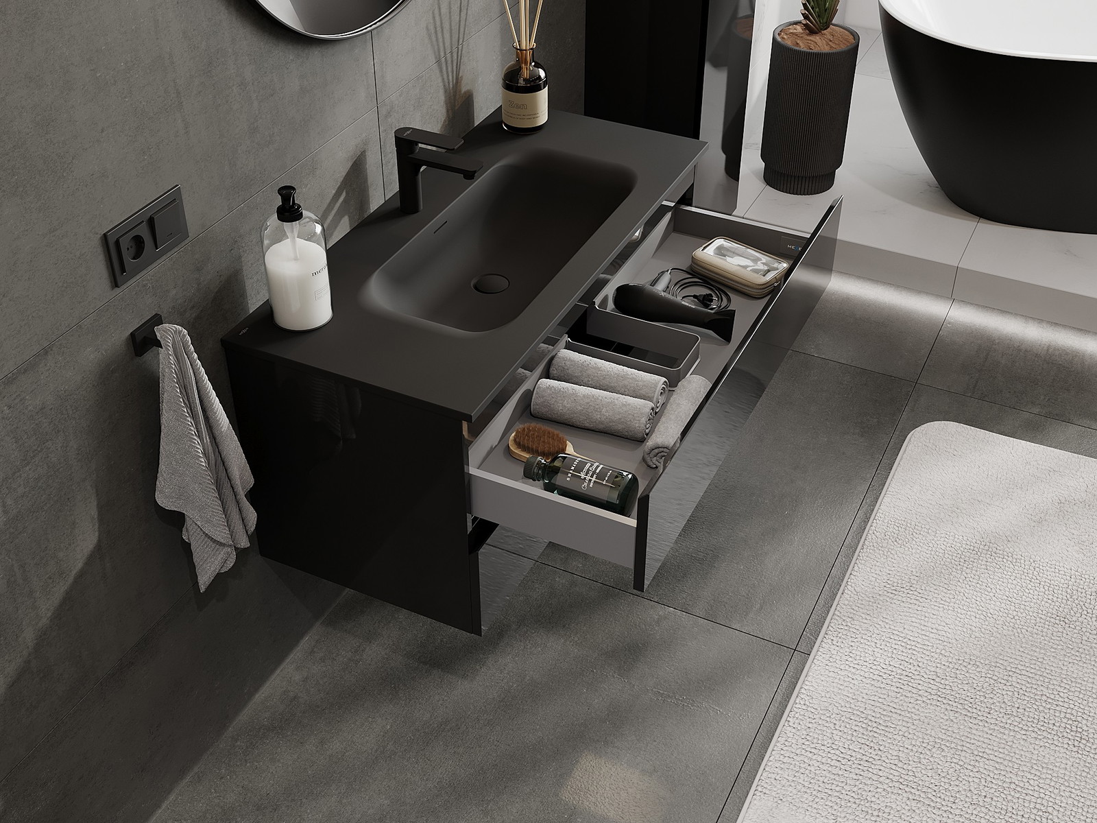 Utskärningen i lådan är utformad på ett sådant sätt att den rymmer vattenlåset som är nödvändigt i tvättställsinstallationer. Tack vare detta kan möbeln installeras fullt ut funktionellt, utan att behöva avstå från utrymme i lådan för installationen.
