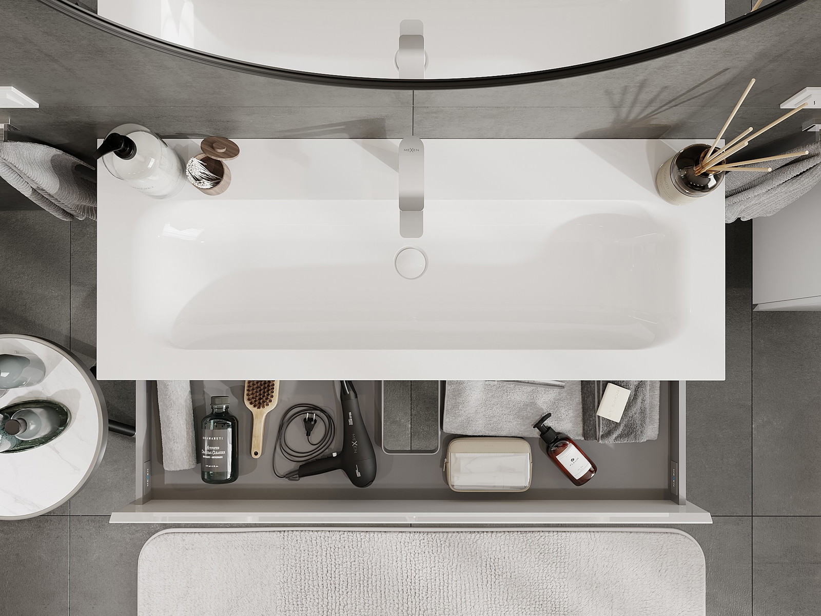 Utskärningen i lådan är utformad på ett sådant sätt att den rymmer vattenlåset som är nödvändigt i tvättställsinstallationer. Tack vare detta kan möbeln installeras fullt ut funktionellt, utan att behöva avstå från utrymme i lådan för installationen.