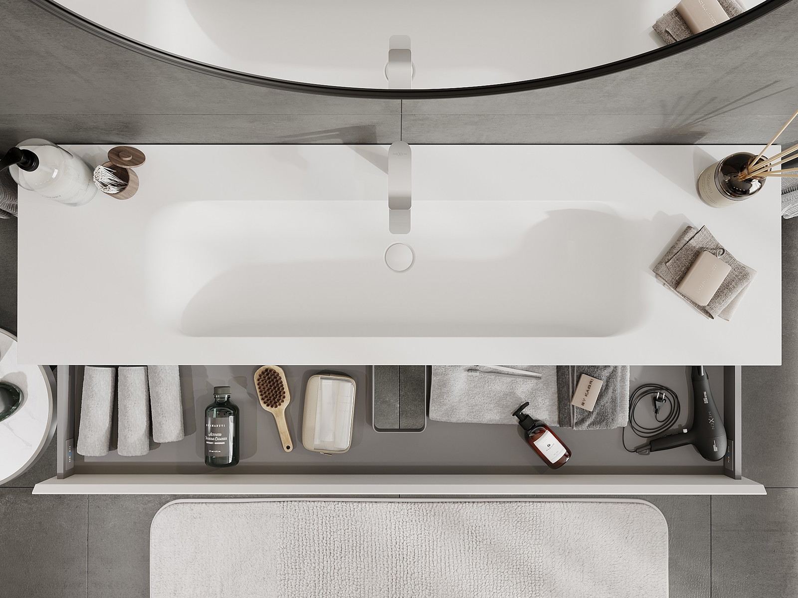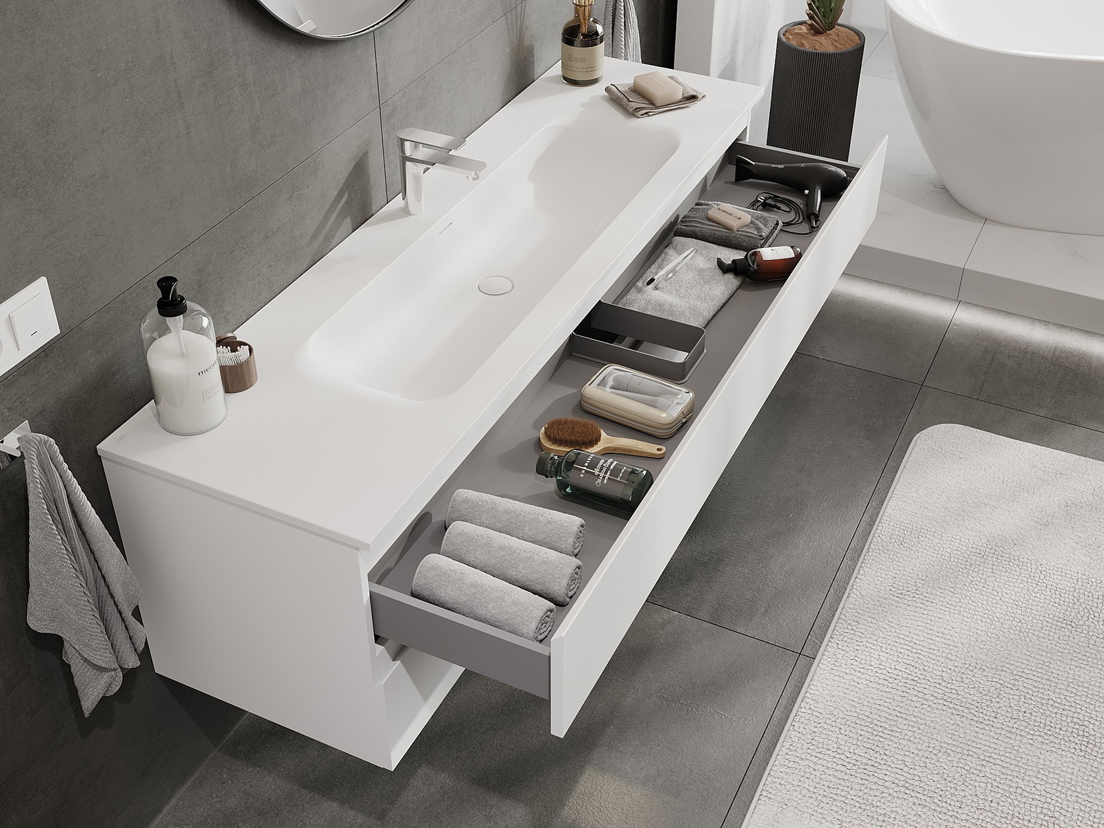 Utskärningen i lådan är utformad på ett sådant sätt att den rymmer vattenlåset som är nödvändigt i tvättställsinstallationer. Tack vare detta kan möbeln installeras fullt ut funktionellt, utan att behöva avstå från utrymme i lådan för installationen.