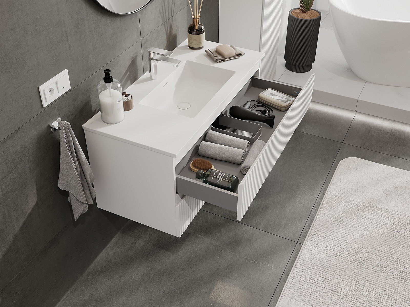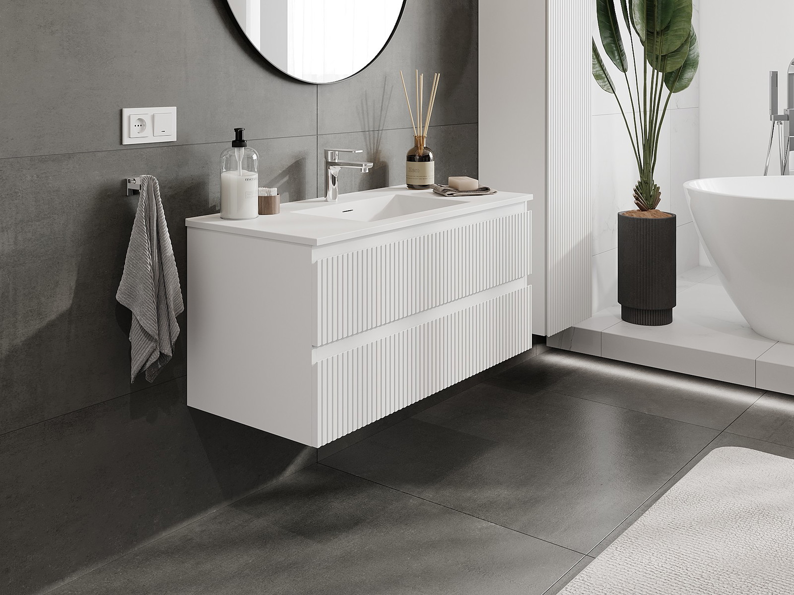 Mexen Rivel badrumsskåp 100 cm med handfat Otis, 2 lådor, räfflad, vit matt - 91A20-10047-2-BFF01-W18M01