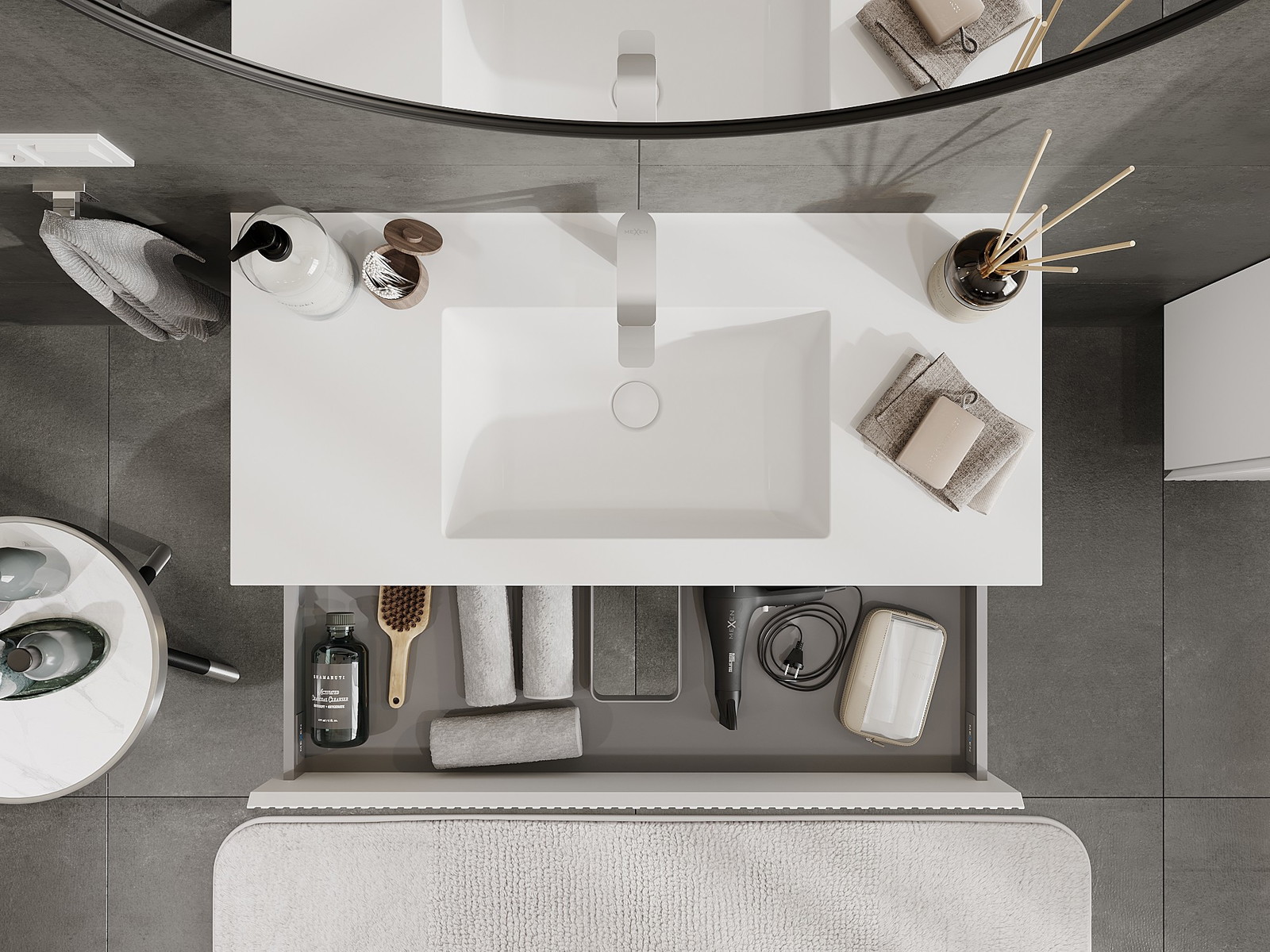 Utskärningen i lådan är utformad på ett sådant sätt att den rymmer vattenlåset som är nödvändigt i tvättställsinstallationer. Tack vare detta kan möbeln installeras fullt ut funktionellt, utan att behöva avstå från utrymme i lådan för installationen.