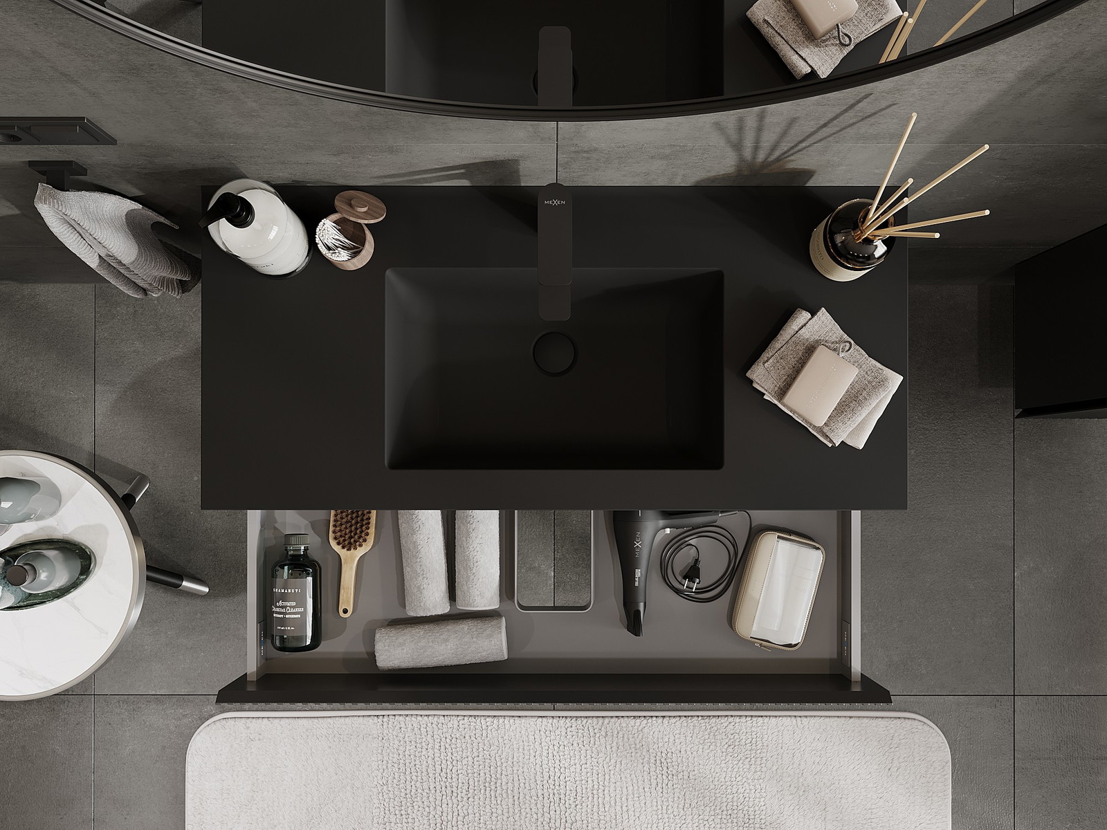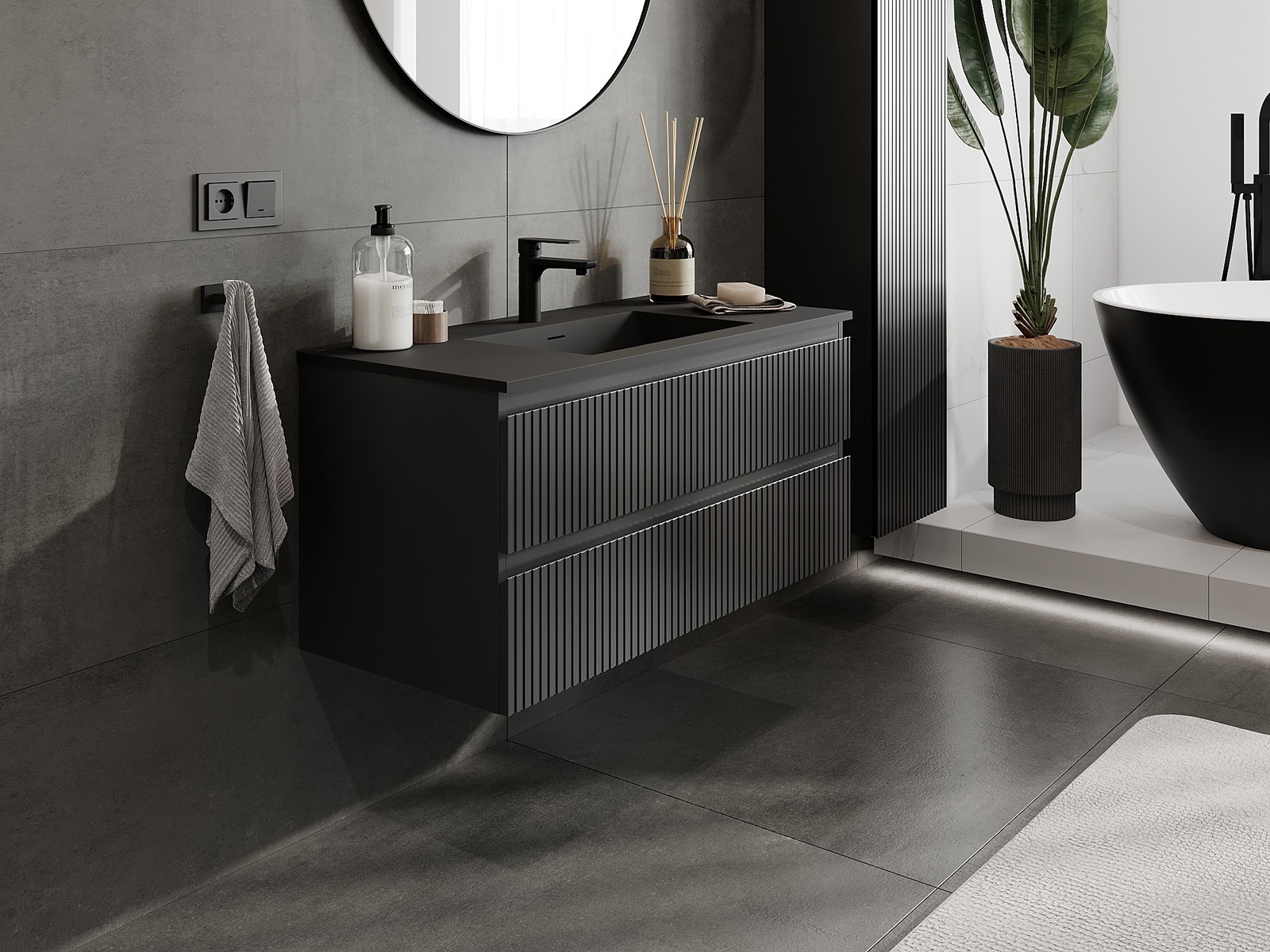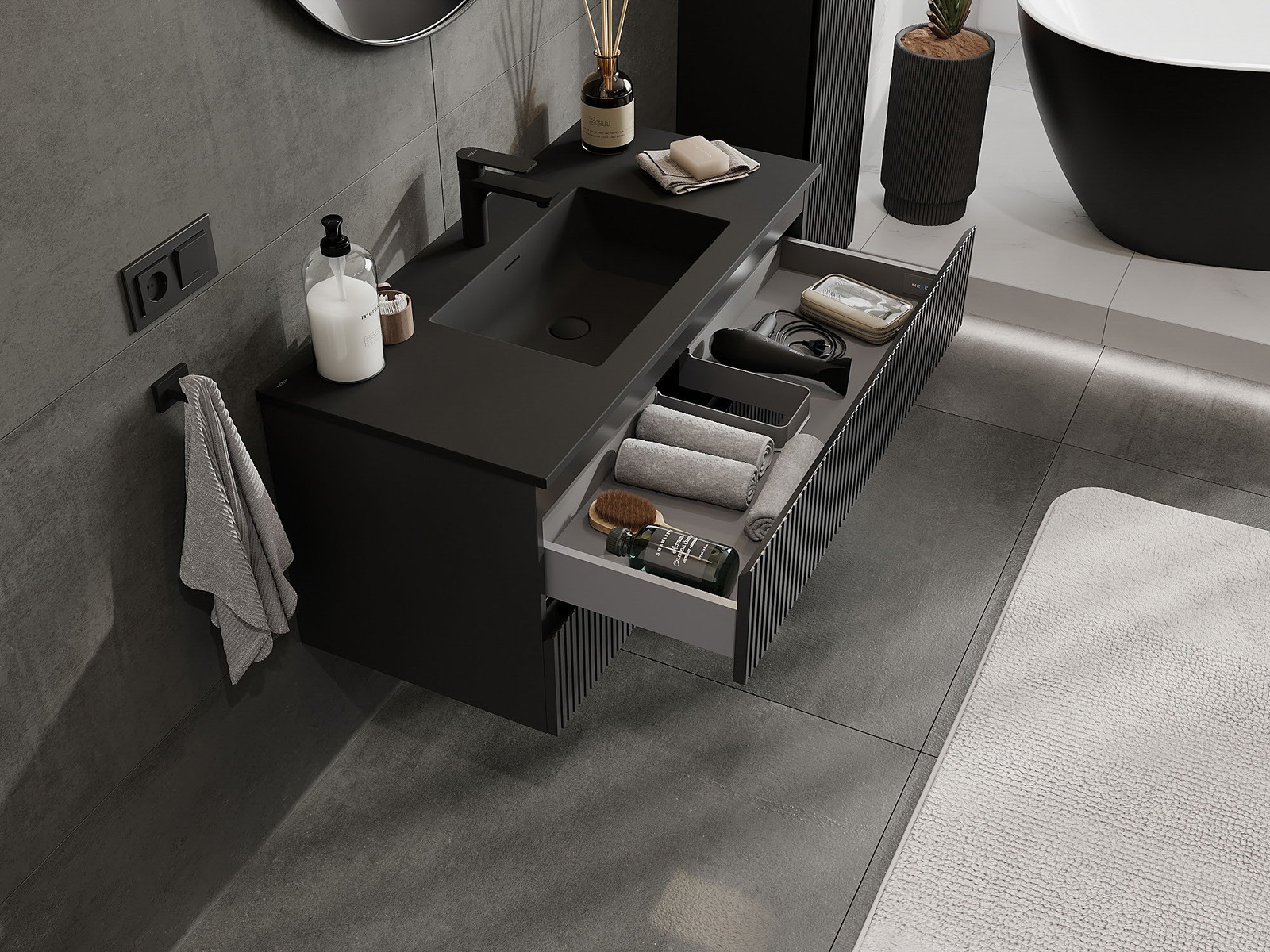 Mexen Rivel badrumsskåp 100 cm med handfat Otis, 2 lådor, räfflad, svart matt - 91A20-10047-2-BFF71-W18M71