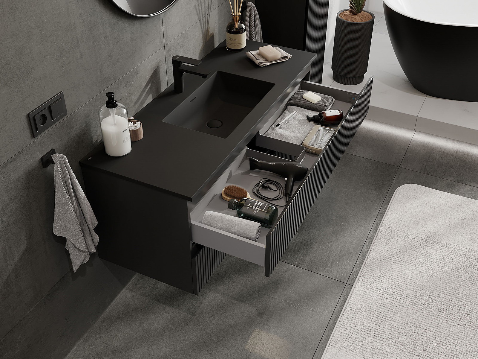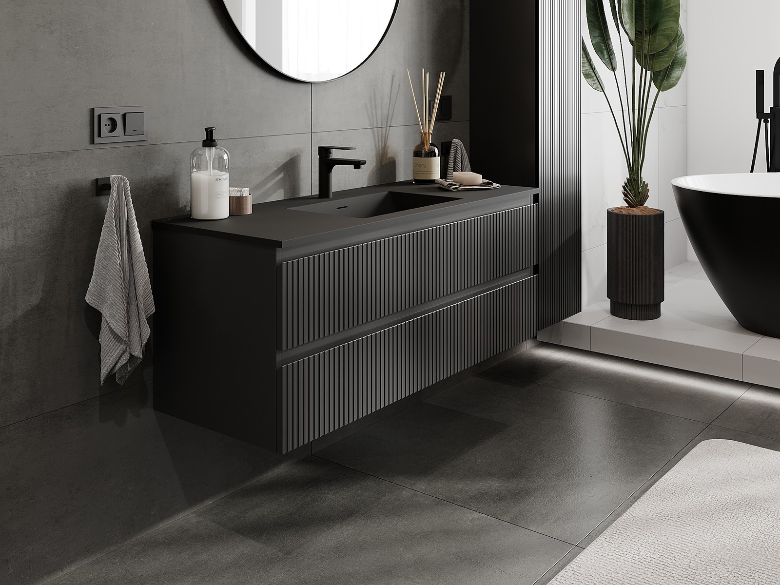 Mexen Rivel badrumsskåp 120 cm med handfat Otis, 2 lådor, räfflad, svart matt - 91A20-12047-2-BFF71-W18M71