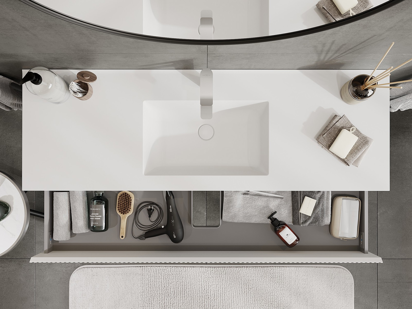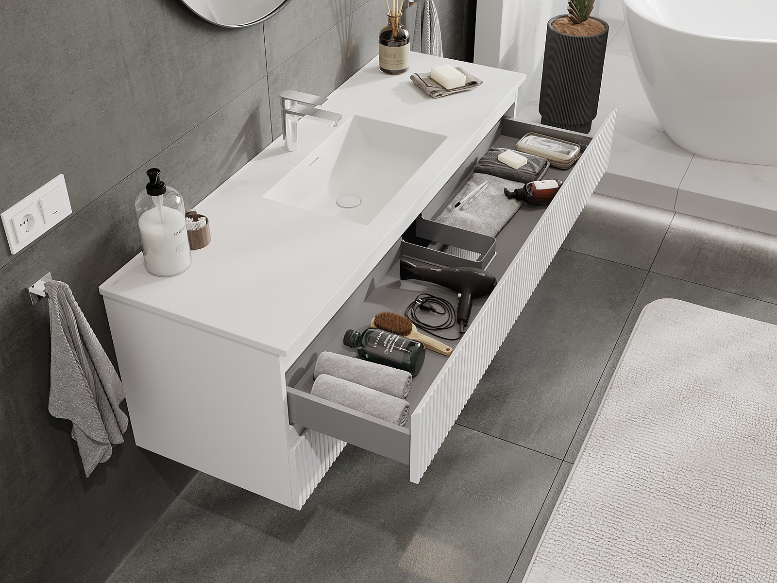 Utskärningen i lådan är utformad på ett sådant sätt att den rymmer vattenlåset som är nödvändigt i tvättställsinstallationer. Tack vare detta kan möbeln installeras fullt ut funktionellt, utan att behöva avstå från utrymme i lådan för installationen.