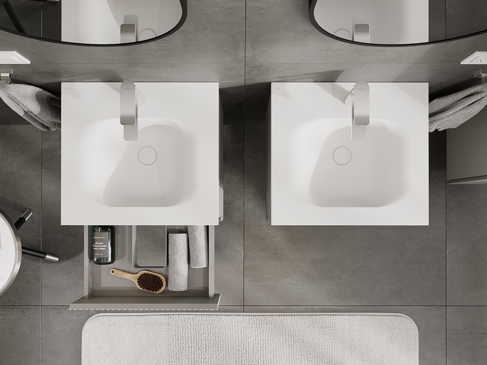 Utskärningen i lådan är utformad på ett sådant sätt att den rymmer vattenlåset som är nödvändigt i tvättställsinstallationer. Tack vare detta kan möbeln installeras fullt ut funktionellt, utan att behöva avstå från utrymme i lådan för installationen.
