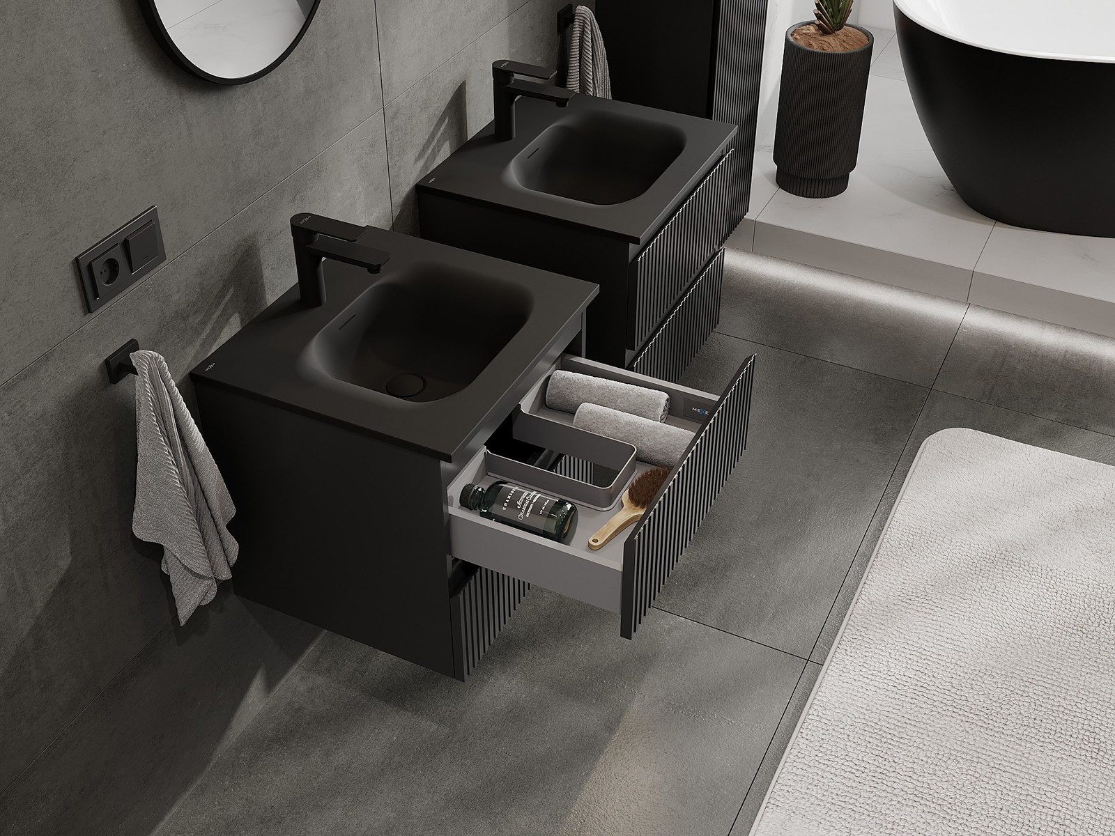 Utskärningen i lådan är utformad på ett sådant sätt att den rymmer vattenlåset som är nödvändigt i tvättställsinstallationer. Tack vare detta kan möbeln installeras fullt ut funktionellt, utan att behöva avstå från utrymme i lådan för installationen.