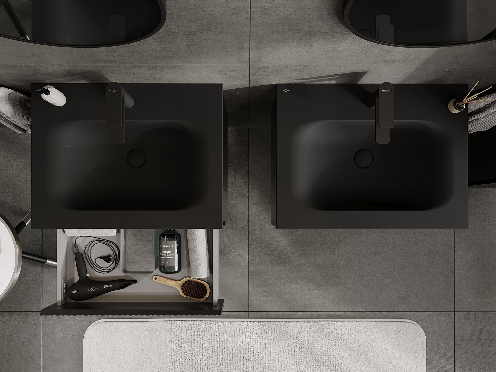 Utskärningen i lådan är utformad på ett sådant sätt att den rymmer vattenlåset som är nödvändigt i tvättställsinstallationer. Tack vare detta kan möbeln installeras fullt ut funktionellt, utan att behöva avstå från utrymme i lådan för installationen.