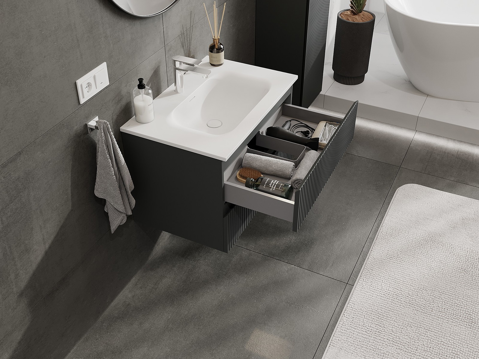 Utskärningen i lådan är utformad på ett sådant sätt att den rymmer vattenlåset som är nödvändigt i tvättställsinstallationer. Tack vare detta kan möbeln installeras fullt ut funktionellt, utan att behöva avstå från utrymme i lådan för installationen.