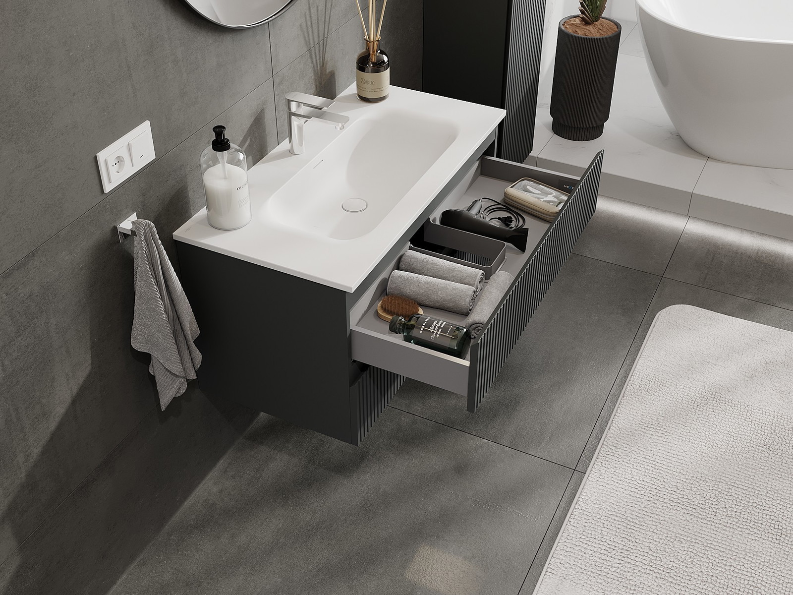 Utskärningen i lådan är utformad på ett sådant sätt att den rymmer vattenlåset som är nödvändigt i tvättställsinstallationer. Tack vare detta kan möbeln installeras fullt ut funktionellt, utan att behöva avstå från utrymme i lådan för installationen.