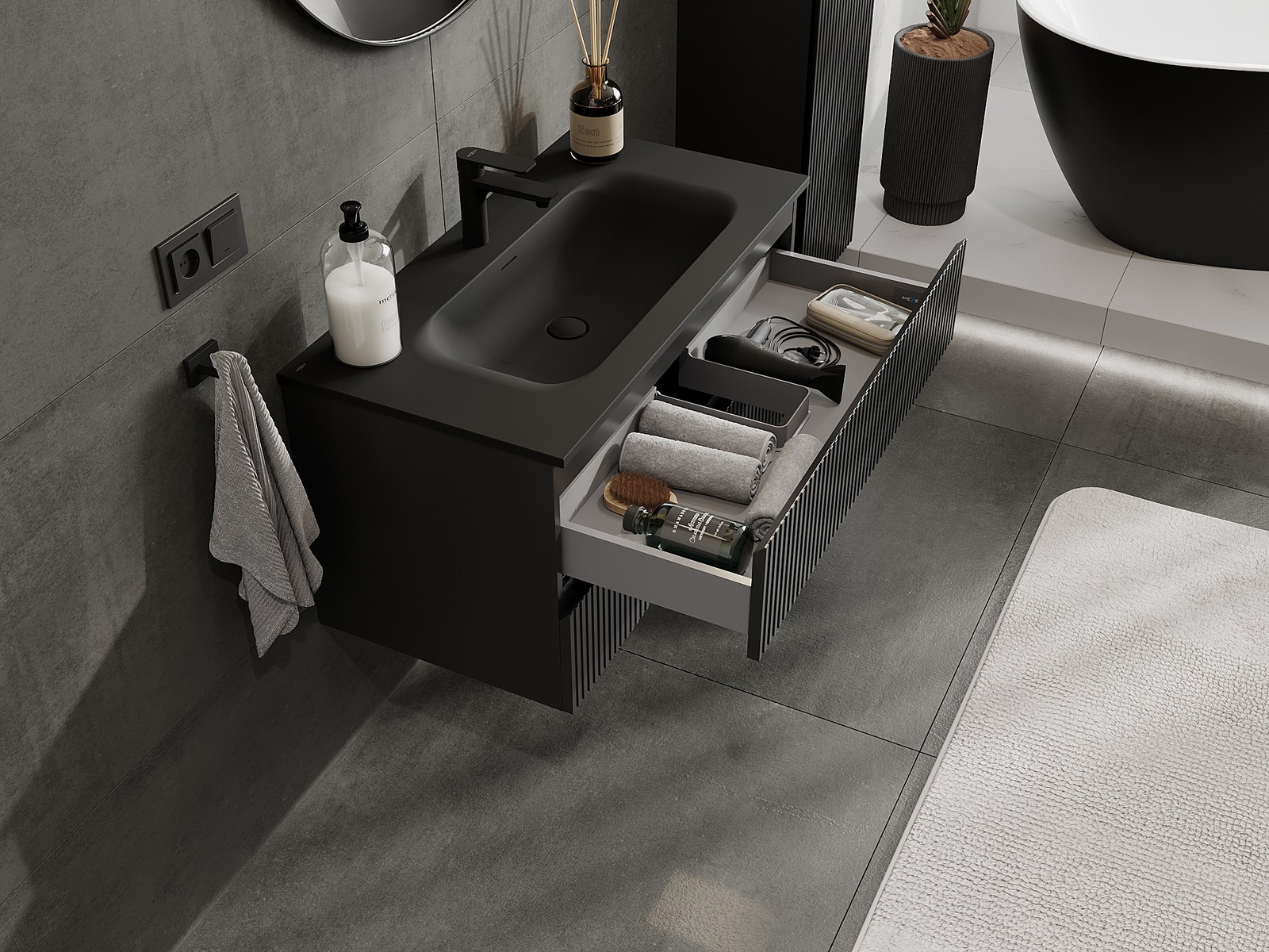 Utskärningen i lådan är utformad på ett sådant sätt att den rymmer vattenlåset som är nödvändigt i tvättställsinstallationer. Tack vare detta kan möbeln installeras fullt ut funktionellt, utan att behöva avstå från utrymme i lådan för installationen.