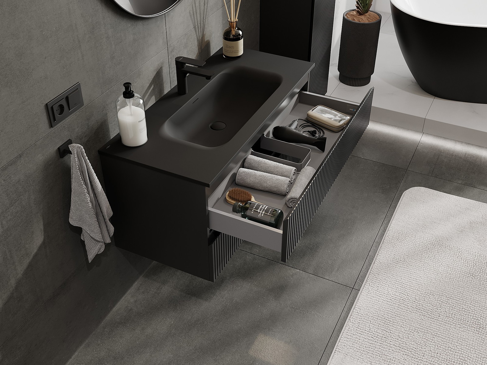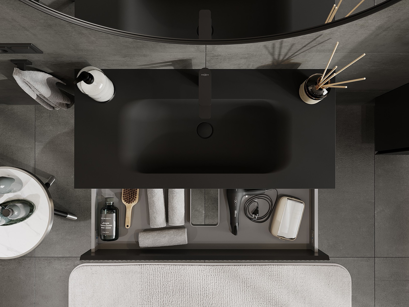 Utskärningen i lådan är utformad på ett sådant sätt att den rymmer vattenlåset som är nödvändigt i tvättställsinstallationer. Tack vare detta kan möbeln installeras fullt ut funktionellt, utan att behöva avstå från utrymme i lådan för installationen.