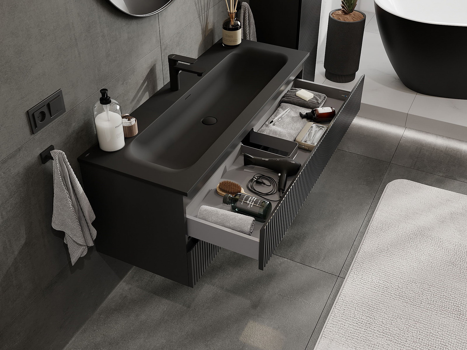 Utskärningen i lådan är utformad på ett sådant sätt att den rymmer vattenlåset som är nödvändigt i tvättställsinstallationer. Tack vare detta kan möbeln installeras fullt ut funktionellt, utan att behöva avstå från utrymme i lådan för installationen.