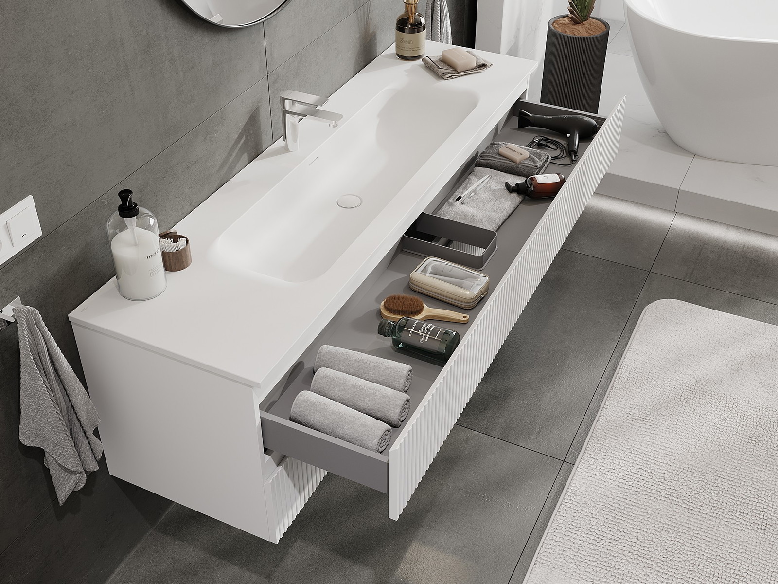 Utskärningen i lådan är utformad på ett sådant sätt att den rymmer vattenlåset som är nödvändigt i tvättställsinstallationer. Tack vare detta kan möbeln installeras fullt ut funktionellt, utan att behöva avstå från utrymme i lådan för installationen.