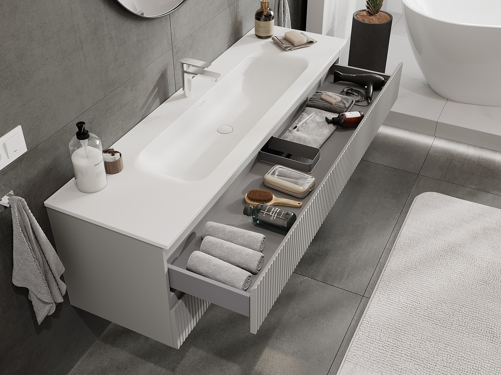 Utskärningen i lådan är utformad på ett sådant sätt att den rymmer vattenlåset som är nödvändigt i tvättställsinstallationer. Tack vare detta kan möbeln installeras fullt ut funktionellt, utan att behöva avstå från utrymme i lådan för installationen.