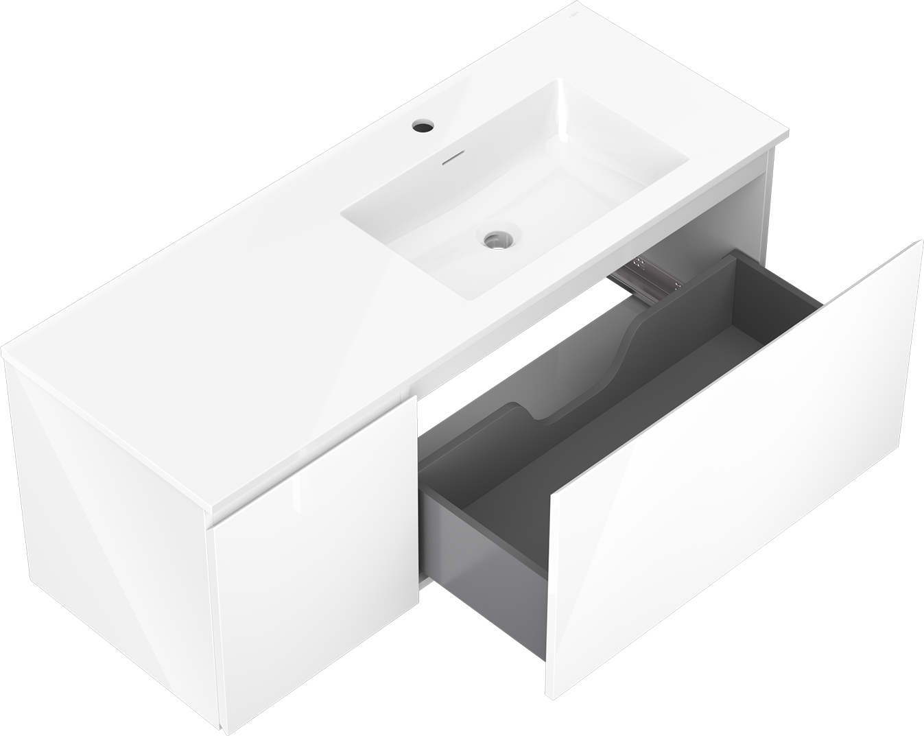 Utskärningen i lådan är utformad på ett sådant sätt att den rymmer vattenlåset som är nödvändigt i tvättställsinstallationer. Tack vare detta kan möbeln installeras fullt ut funktionellt, utan att behöva avstå från utrymme i lådan för installationen.