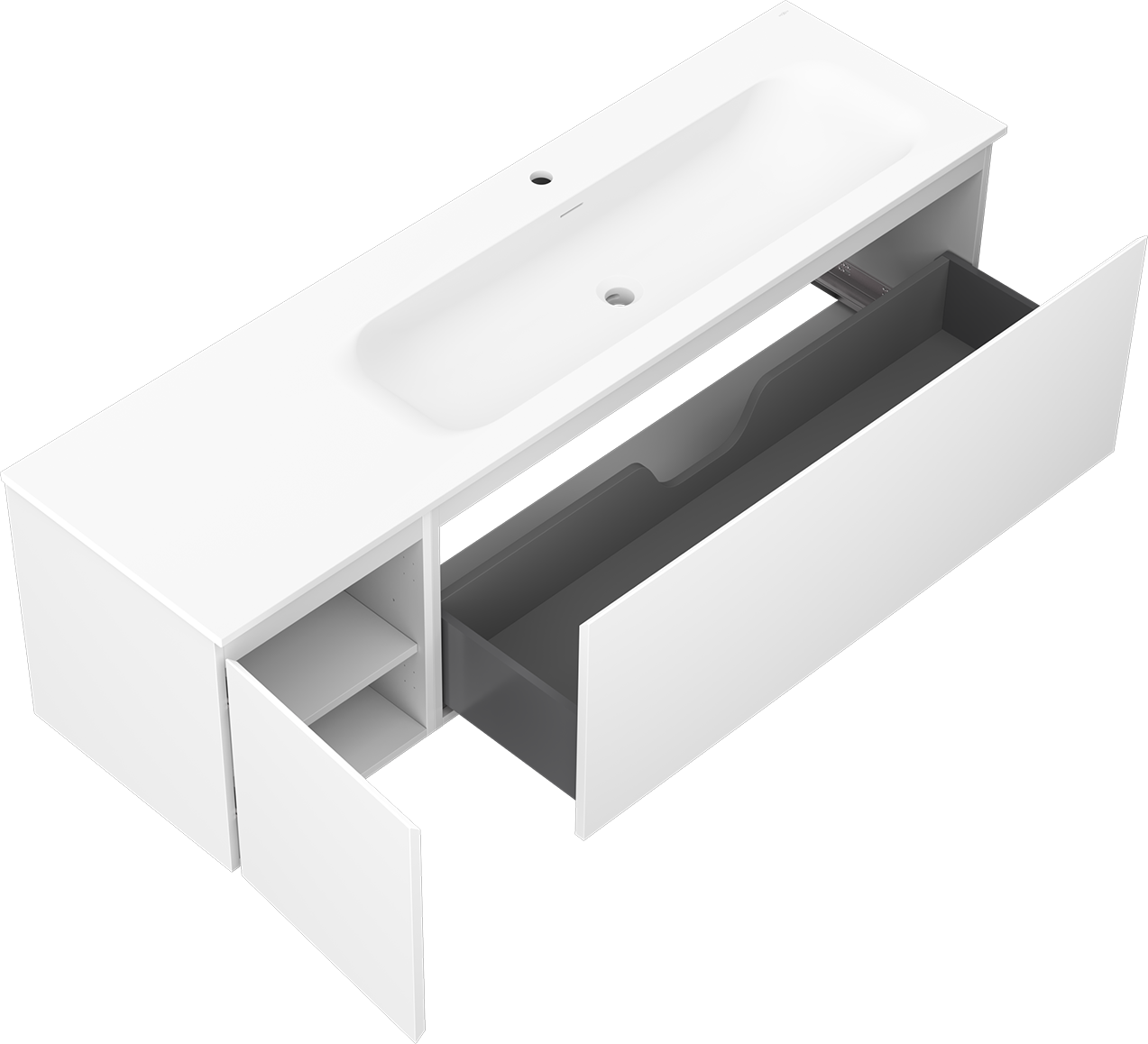 Utskärningen i lådan är utformad på ett sådant sätt att den rymmer vattenlåset som är nödvändigt i tvättställsinstallationer. Tack vare detta kan möbeln installeras fullt ut funktionellt, utan att behöva avstå från utrymme i lådan för installationen.