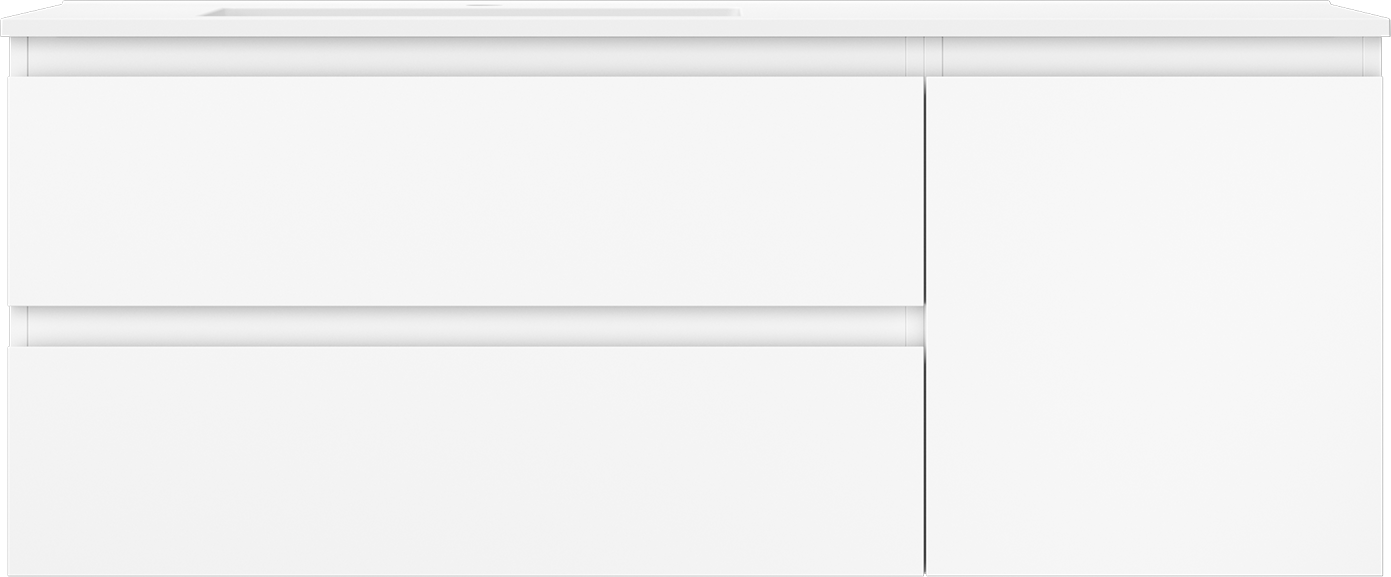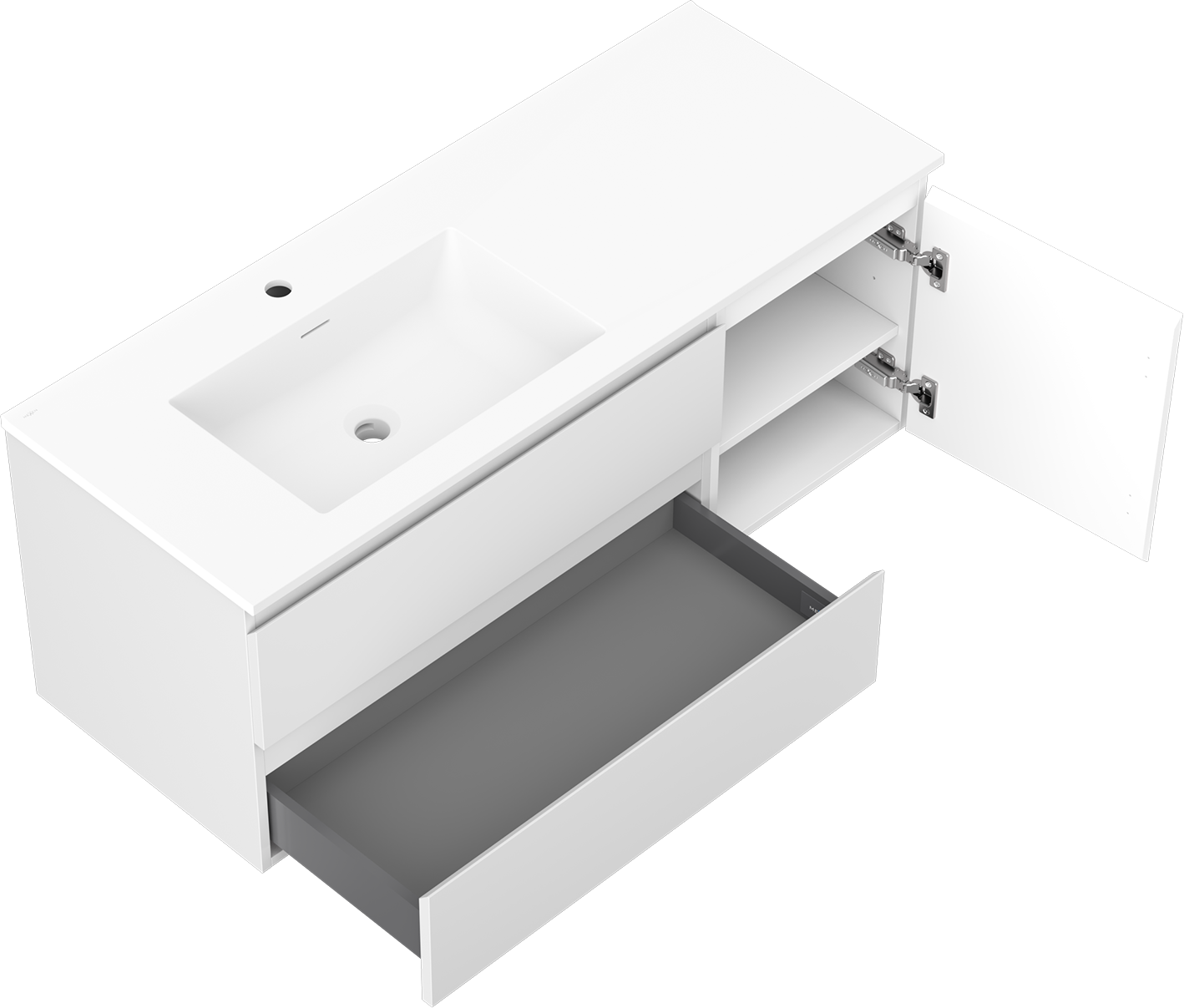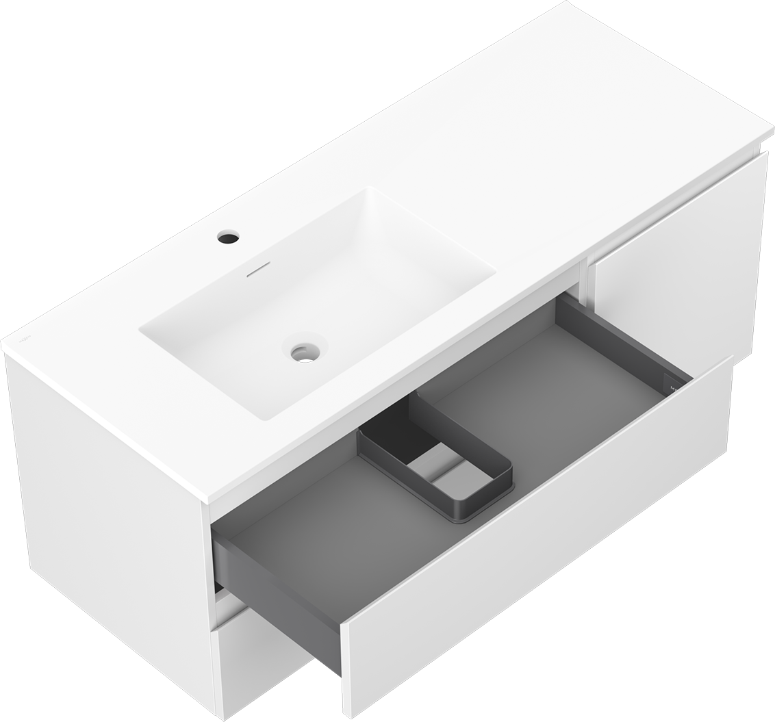 Utskärningen i lådan är utformad på ett sådant sätt att den rymmer vattenlåset som är nödvändigt i tvättställsinstallationer. Tack vare detta kan möbeln installeras fullt ut funktionellt, utan att behöva avstå från utrymme i lådan för installationen.