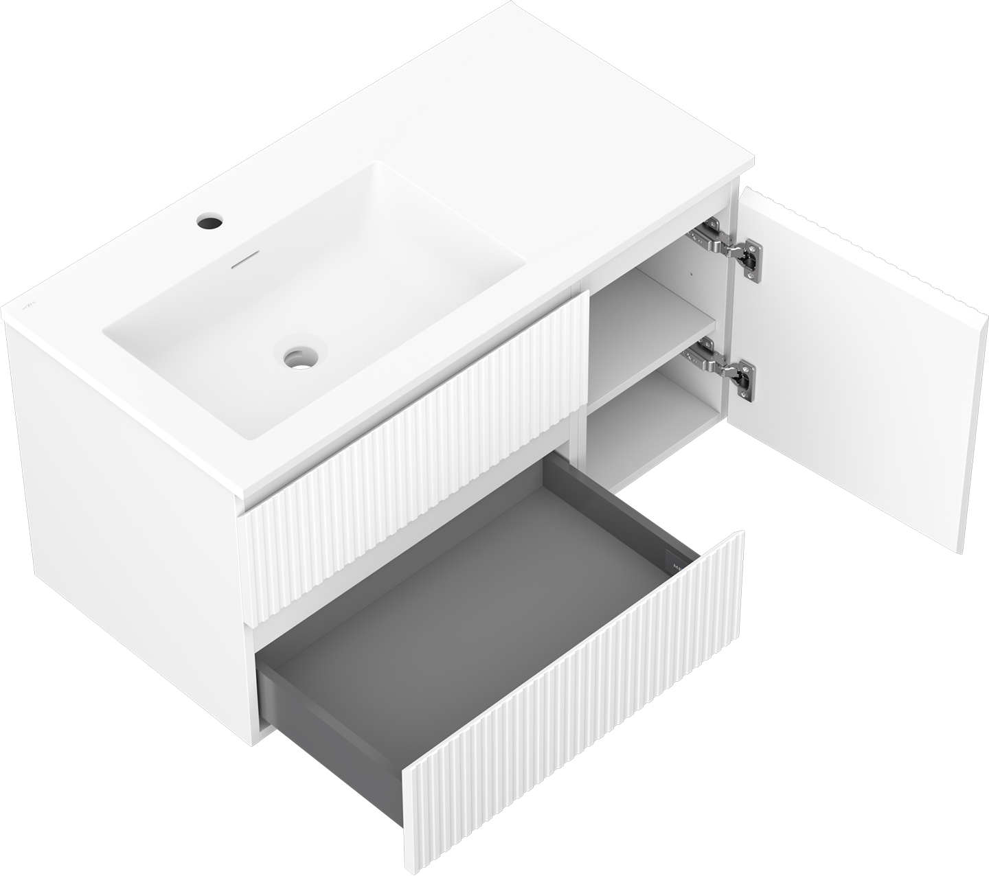 Mexen Rivel 90 cm badrumsskåp med vänster tvättställ Otis, 2S, 1D, räfflad, vit matt - 91A23-09047-3-BBFFF01-W18L01