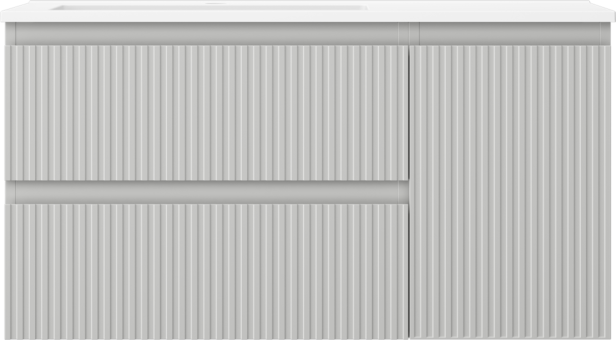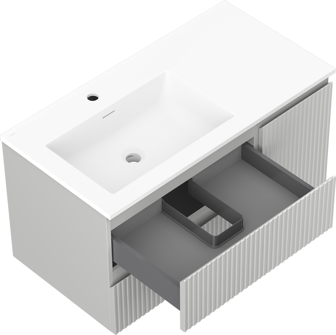 Utskärningen i lådan är utformad på ett sådant sätt att den rymmer vattenlåset som är nödvändigt i tvättställsinstallationer. Tack vare detta kan möbeln installeras fullt ut funktionellt, utan att behöva avstå från utrymme i lådan för installationen.