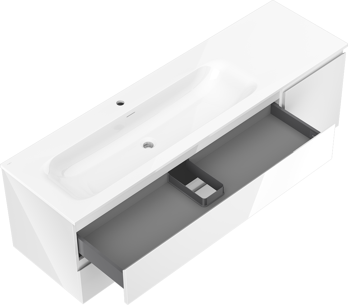 Utskärningen i lådan är utformad på ett sådant sätt att den rymmer vattenlåset som är nödvändigt i tvättställsinstallationer. Tack vare detta kan möbeln installeras fullt ut funktionellt, utan att behöva avstå från utrymme i lådan för installationen.
