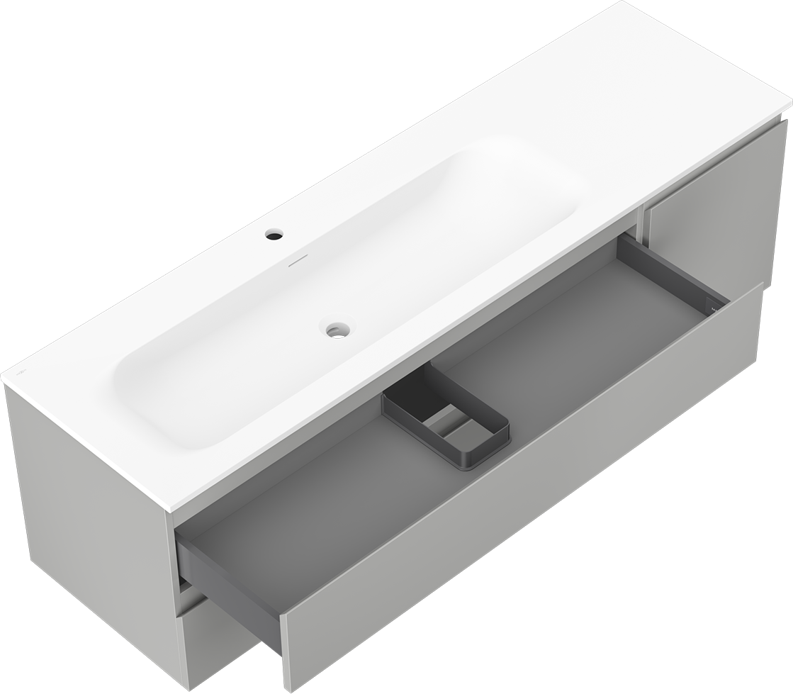 Utskärningen i lådan är utformad på ett sådant sätt att den rymmer vattenlåset som är nödvändigt i tvättställsinstallationer. Tack vare detta kan möbeln installeras fullt ut funktionellt, utan att behöva avstå från utrymme i lådan för installationen.