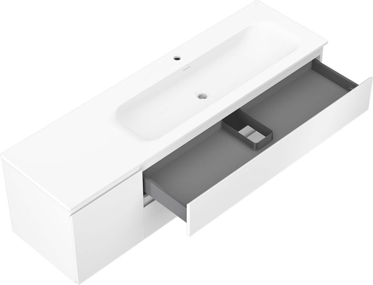 Utskärningen i lådan är utformad på ett sådant sätt att den rymmer vattenlåset som är nödvändigt i tvättställsinstallationer. Tack vare detta kan möbeln installeras fullt ut funktionellt, utan att behöva avstå från utrymme i lådan för installationen.
