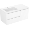 Utskärningen i lådan är utformad på ett sådant sätt att den rymmer vattenlåset som är nödvändigt i tvättställsinstallationer. Tack vare detta kan möbeln installeras fullt ut funktionellt, utan att behöva avstå från utrymme i lådan för installationen.