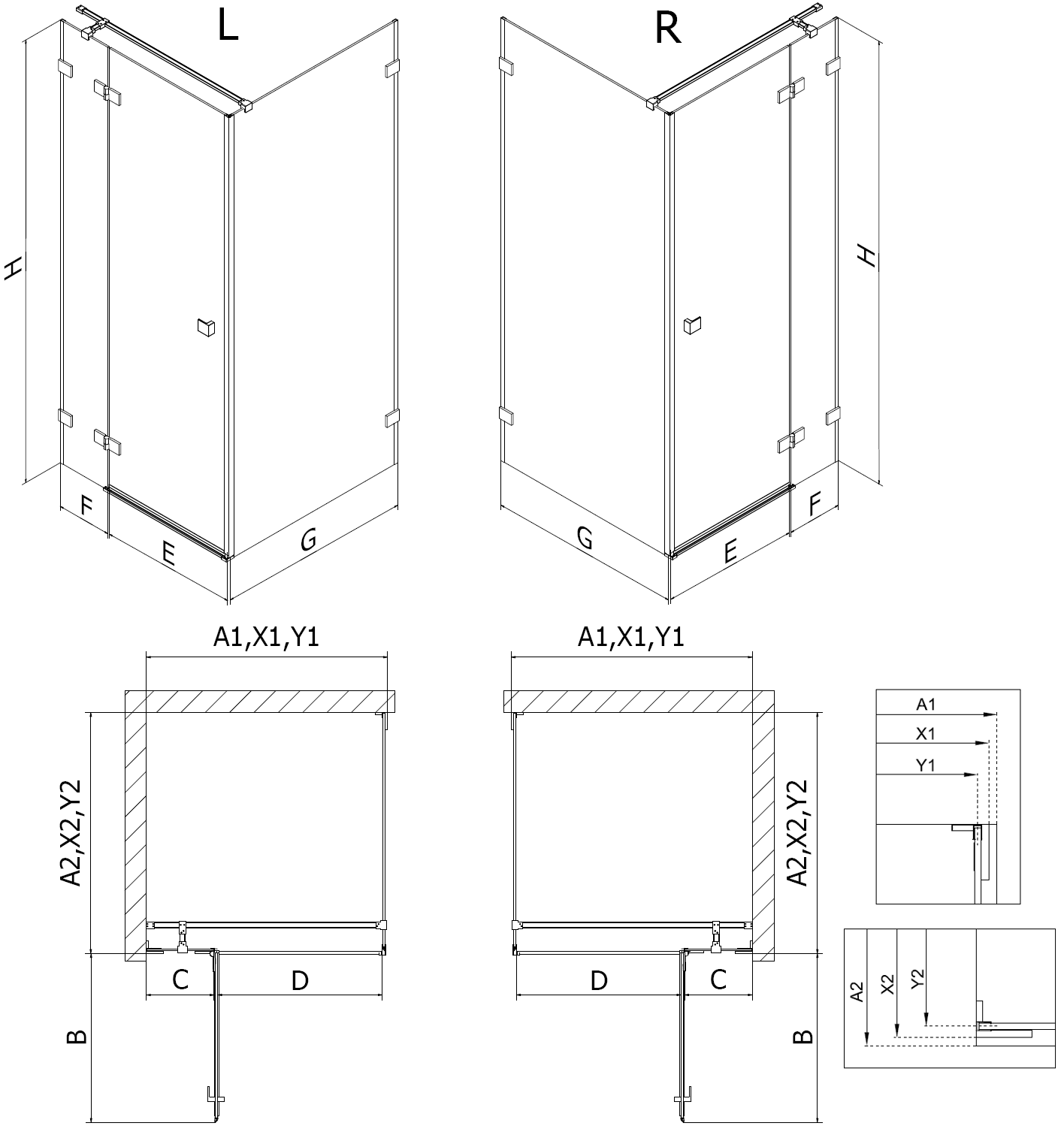 Duschkabiner, dörrar och väggar är som standard anpassade för montering på duschkar med specifika mått. Det är dessa mått som anges i produktnamnet eller beskrivningen. Observera dock att de faktiska måtten på delarna kan skilja sig något från de nominella värdena. Vid planerad montering direkt på golvet rekommenderas en noggrann kontroll av de utvändiga måtten och placeringen av delarna enligt den tekniska ritningen.