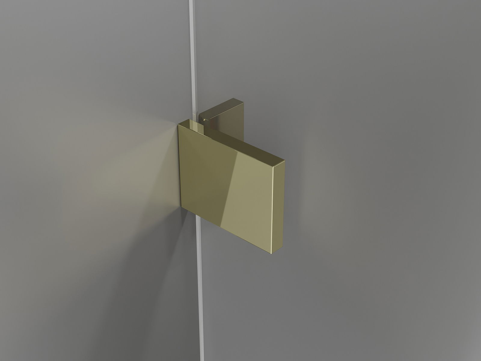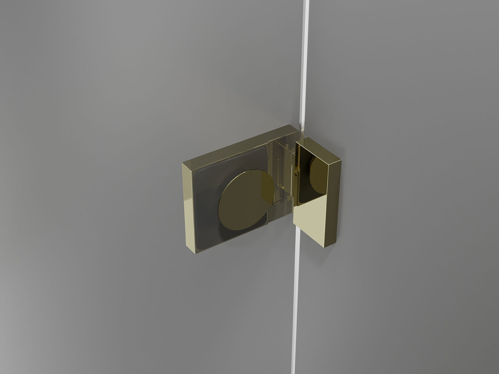 Mässingshandtag och gångjärn inbäddade i glasytan