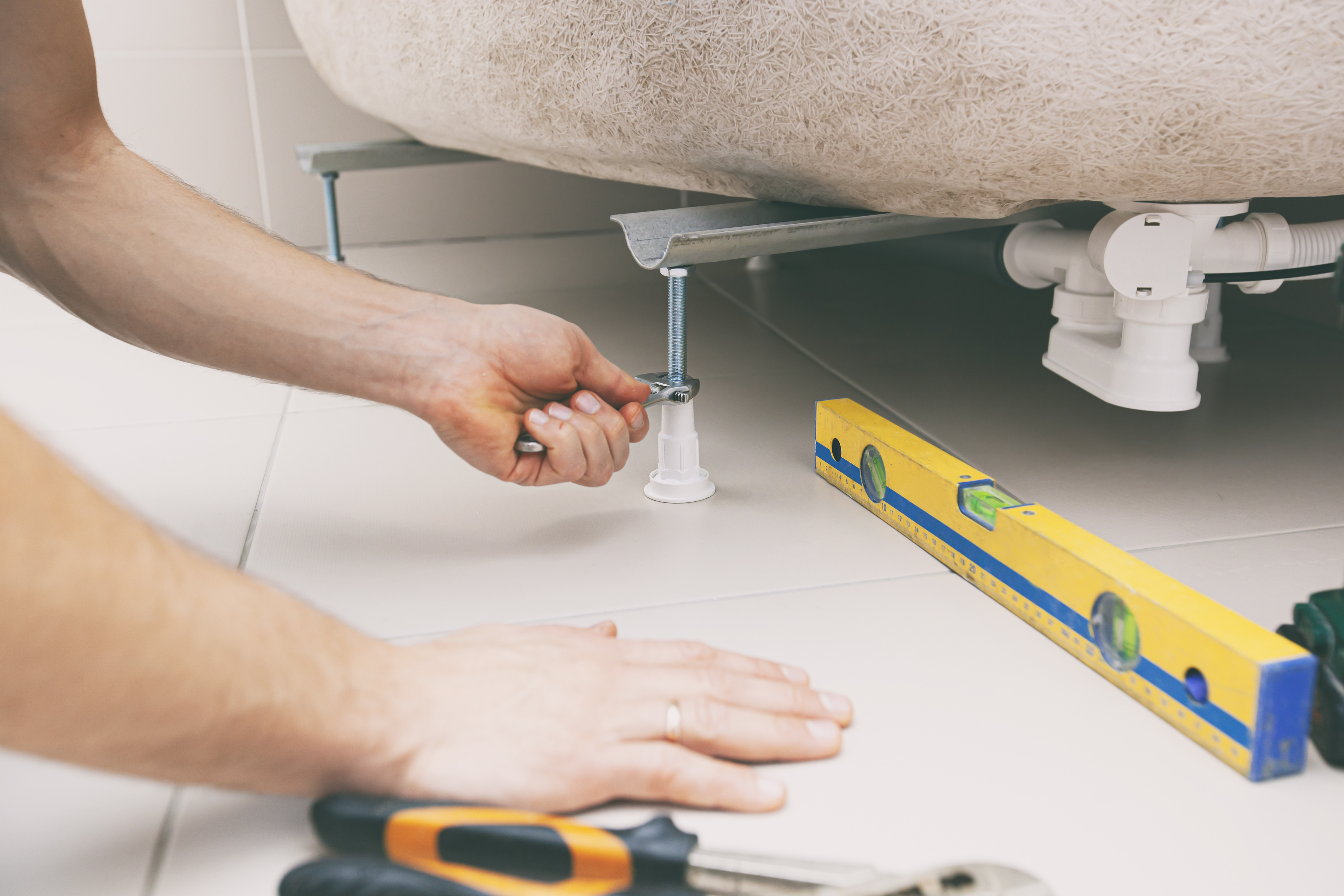 - fastställ duschbrickans höjd genom att skruva fast benen och sätta dem på plattorna,