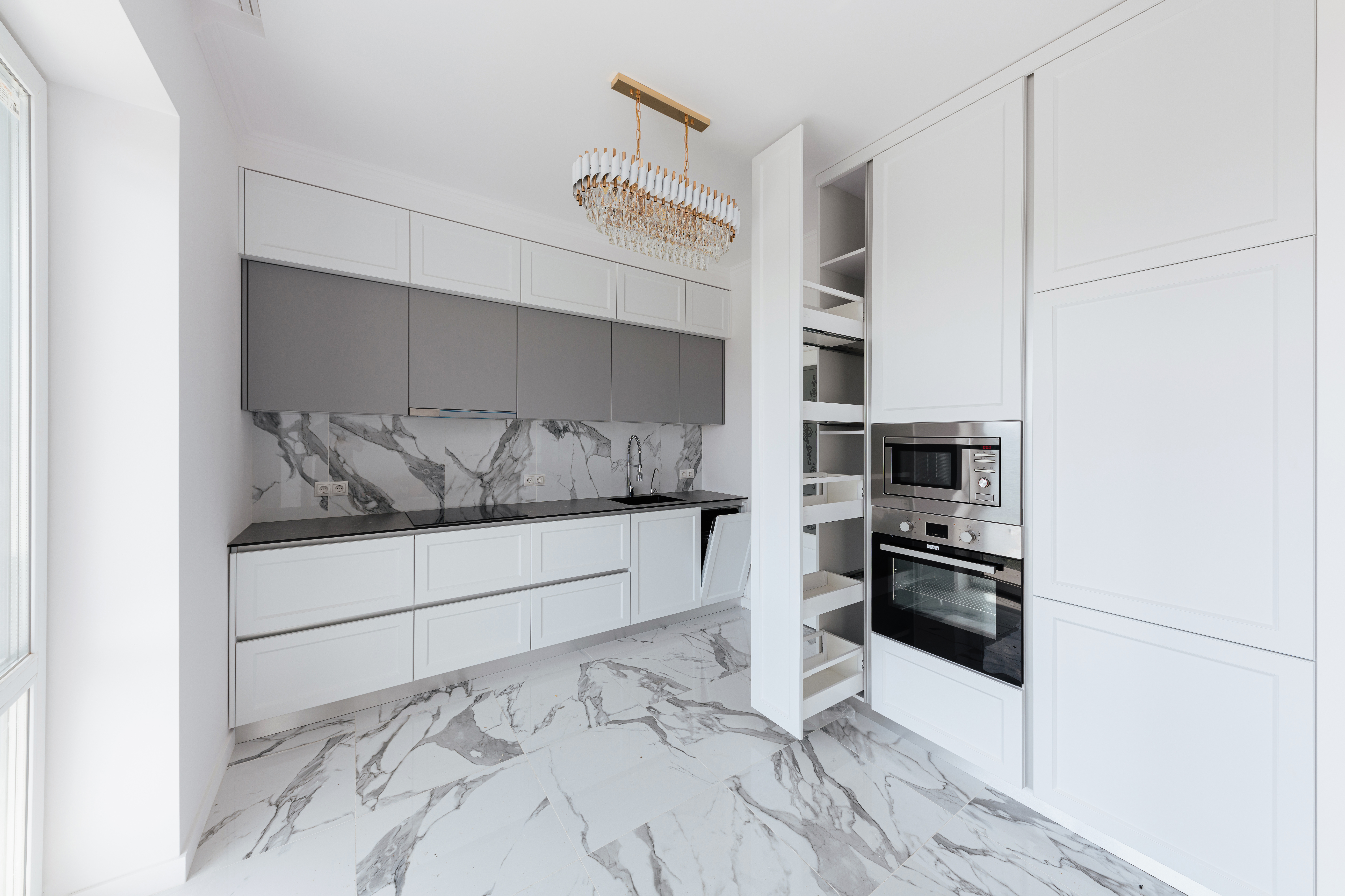 För älskare av traditionella interiörer är det klassiska vit-grå köket en perfekt lösning. Stiliga frästa fronter, subtila handtag och marmorbänkar kommer att betona arrangemangets elegans. Det är värt att satsa på klassiska tillbehör, såsom porslinsburkar, textilier i pastellfärger och lampor i glas.