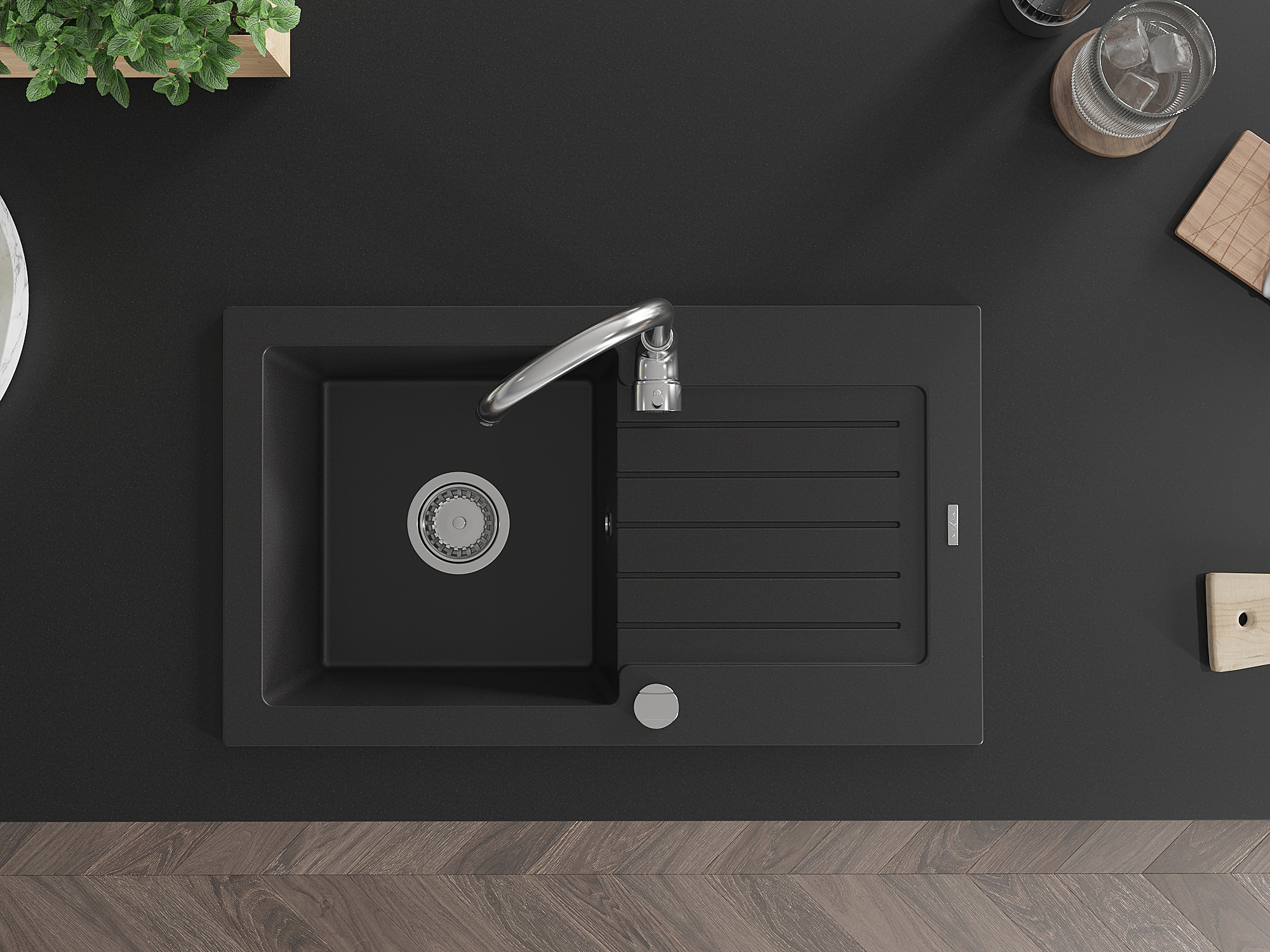 En svart diskbänk är utan tvekan en väldigt originell idé. Den kan bli ett verkligt kökssmycke, särskilt om den matchar de andra elementen i dess utrustning. Svarta diskbänkar i granit ser bäst ut i rum med minimalistisk stil. De passar utmärkt till kök inredda i industriell stil, där onödiga detaljer saknas.